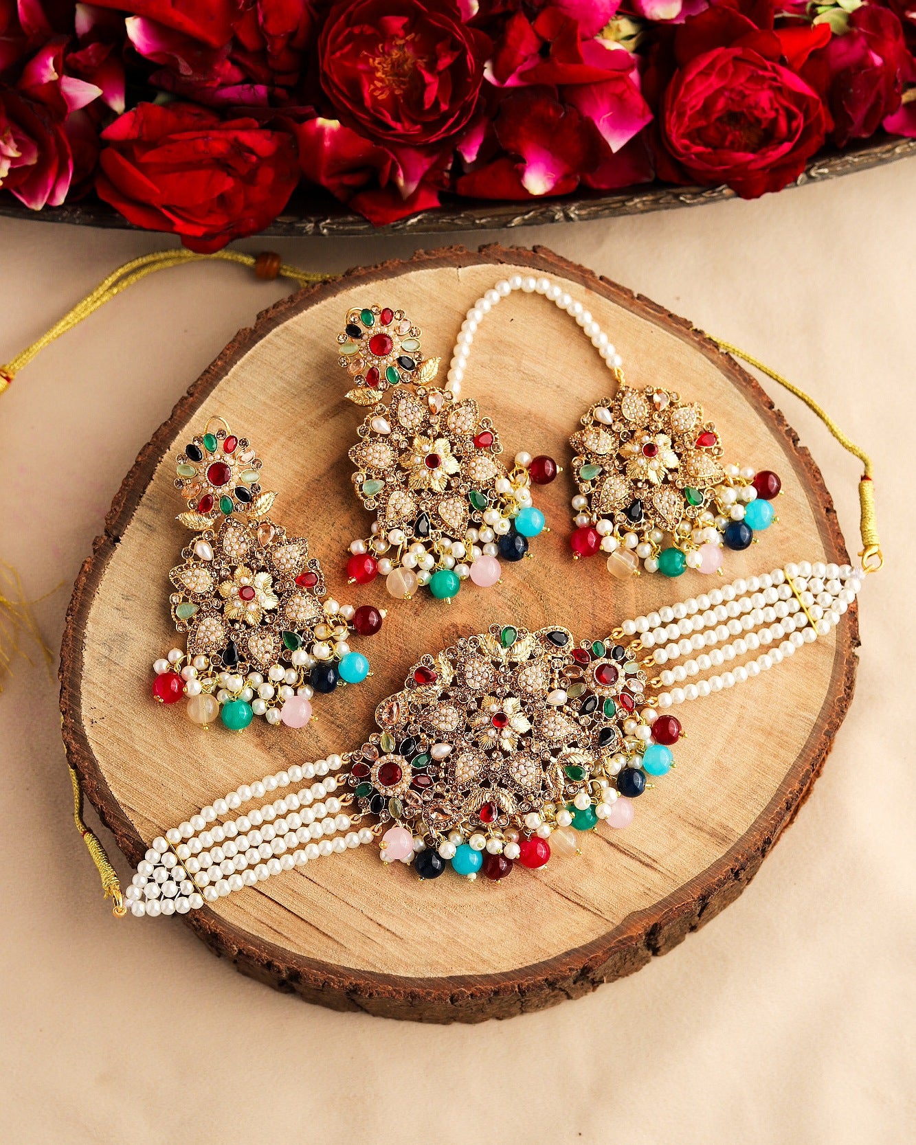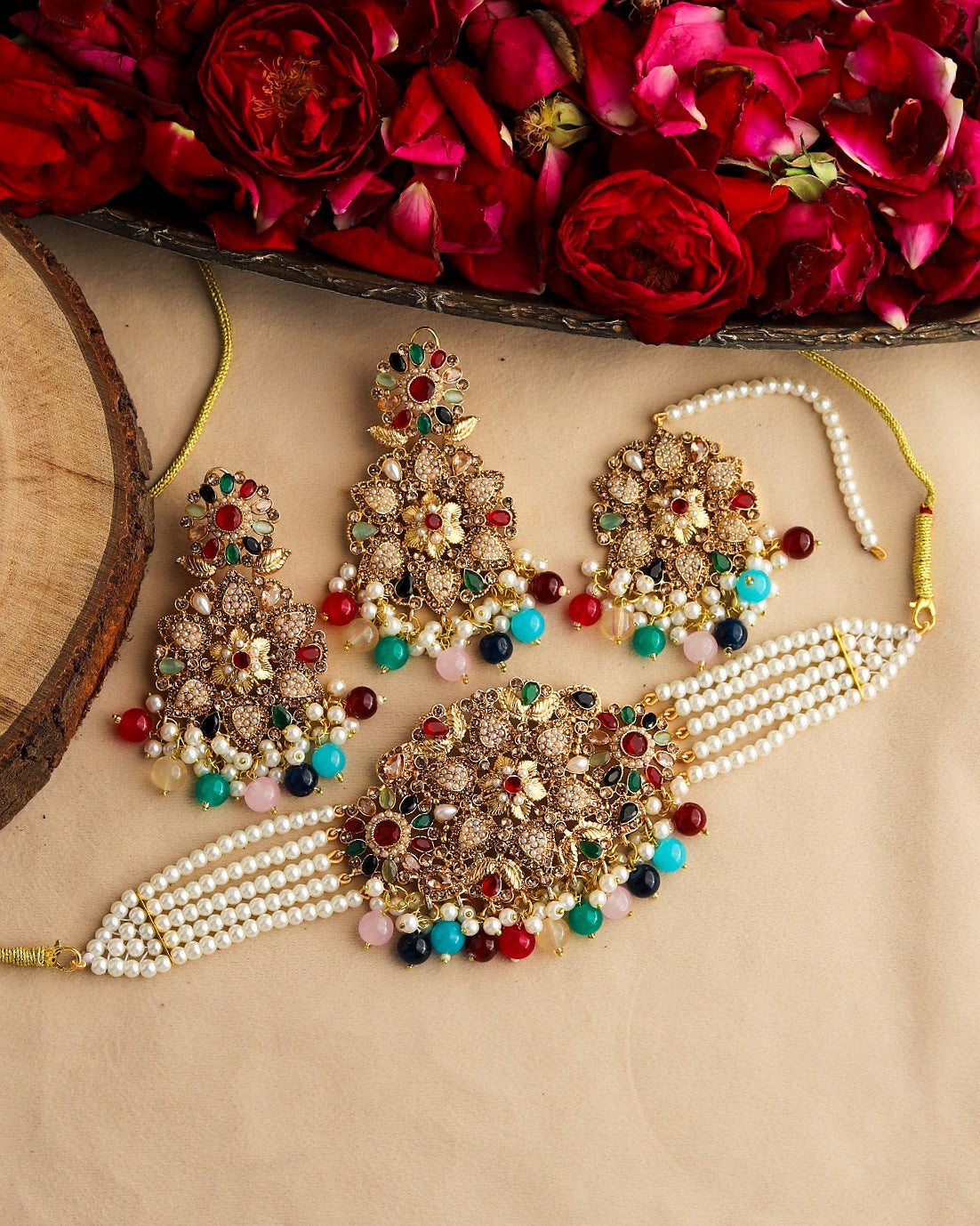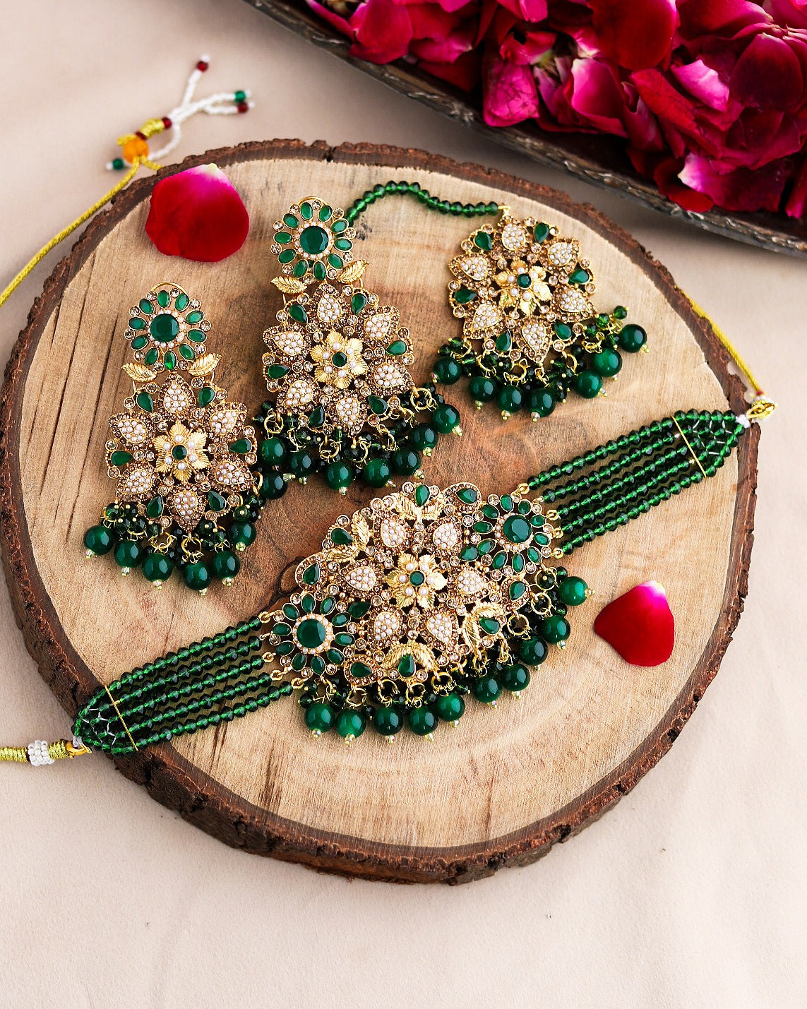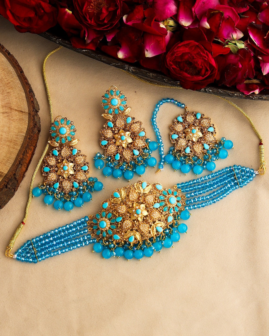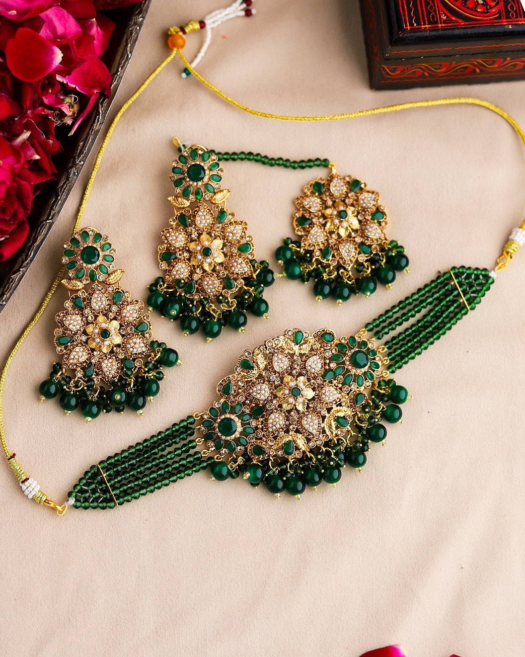 Traditional Choker Set Grace your neckline with this exquisite choker, paired with matching earrings for a royal ethnic look.