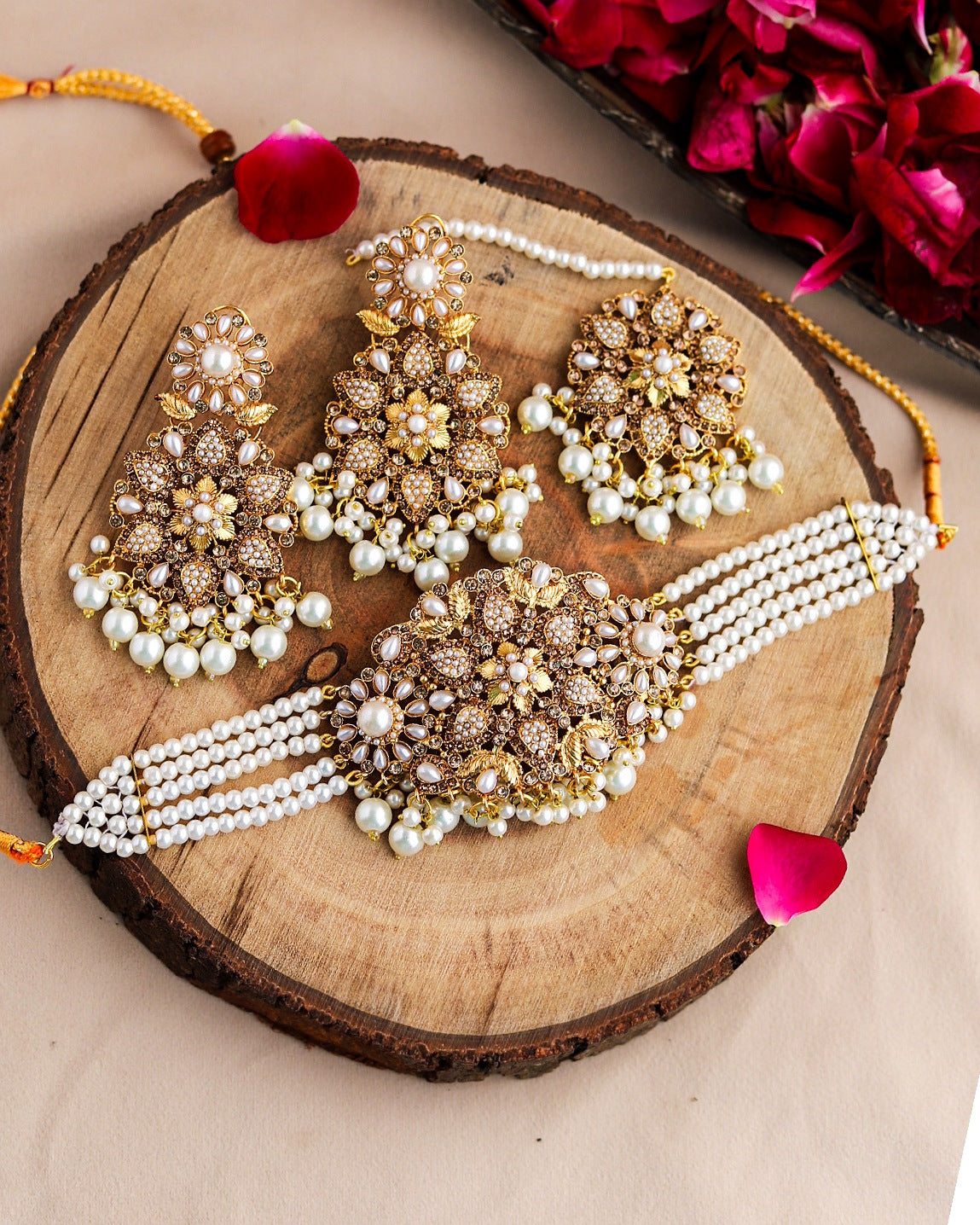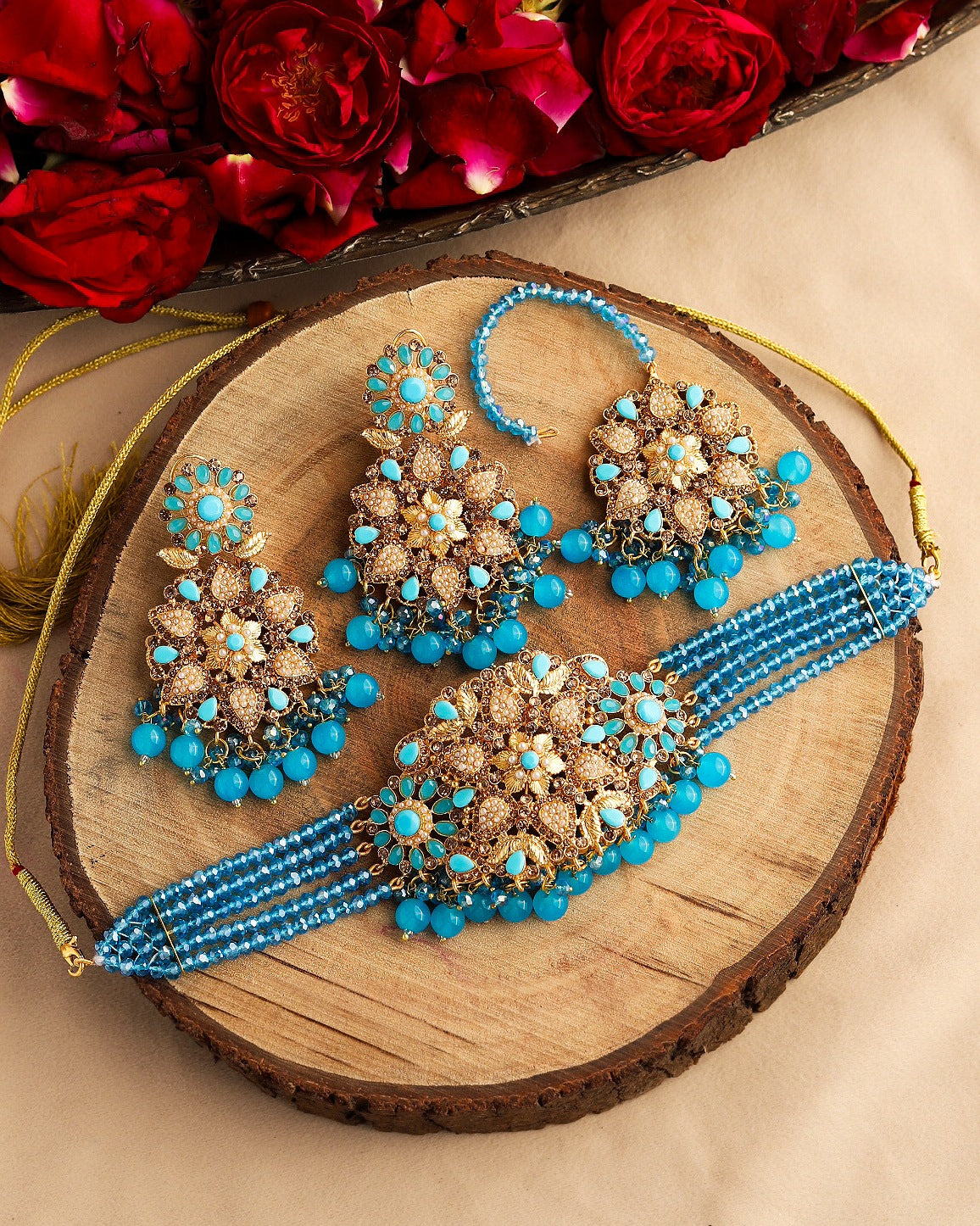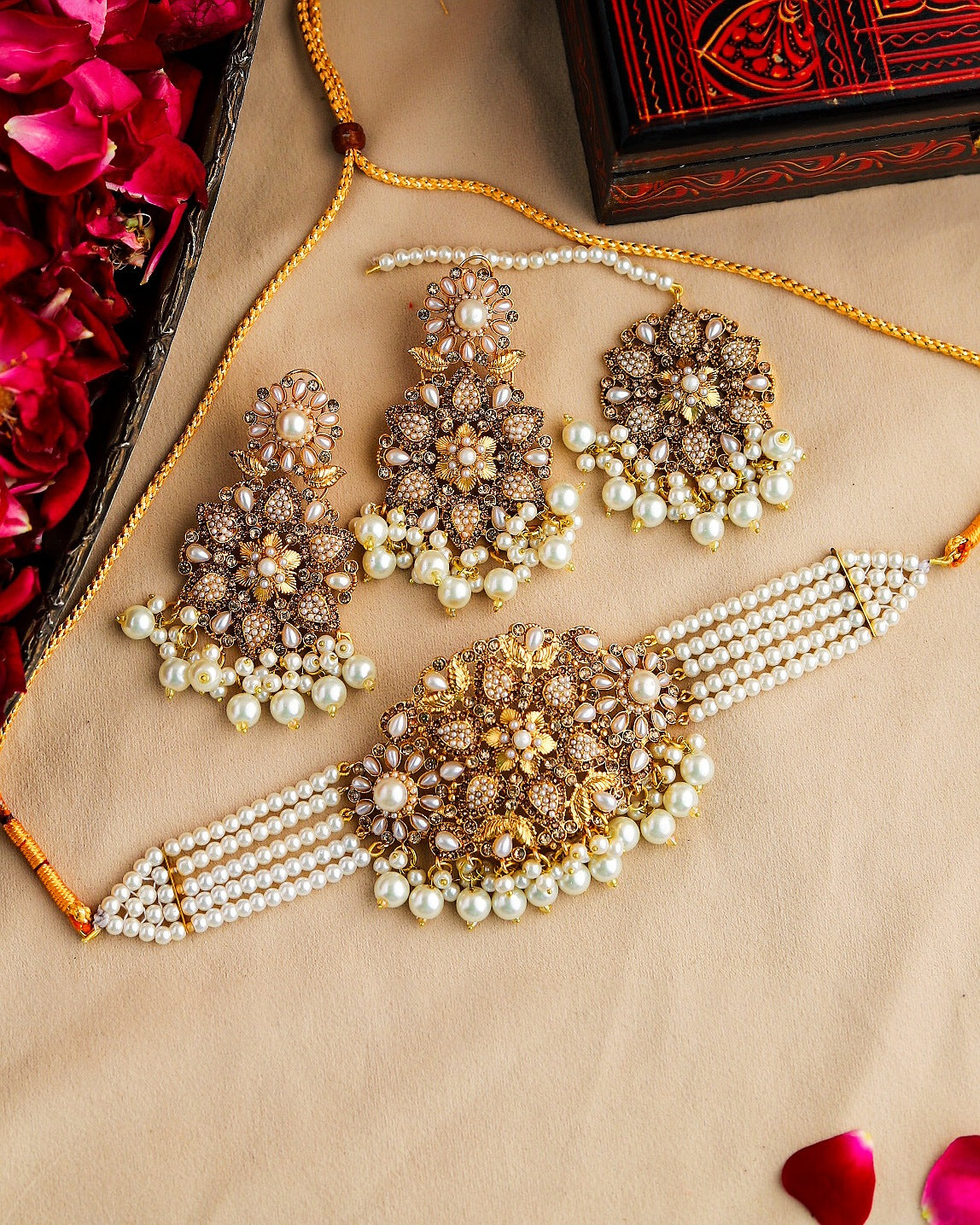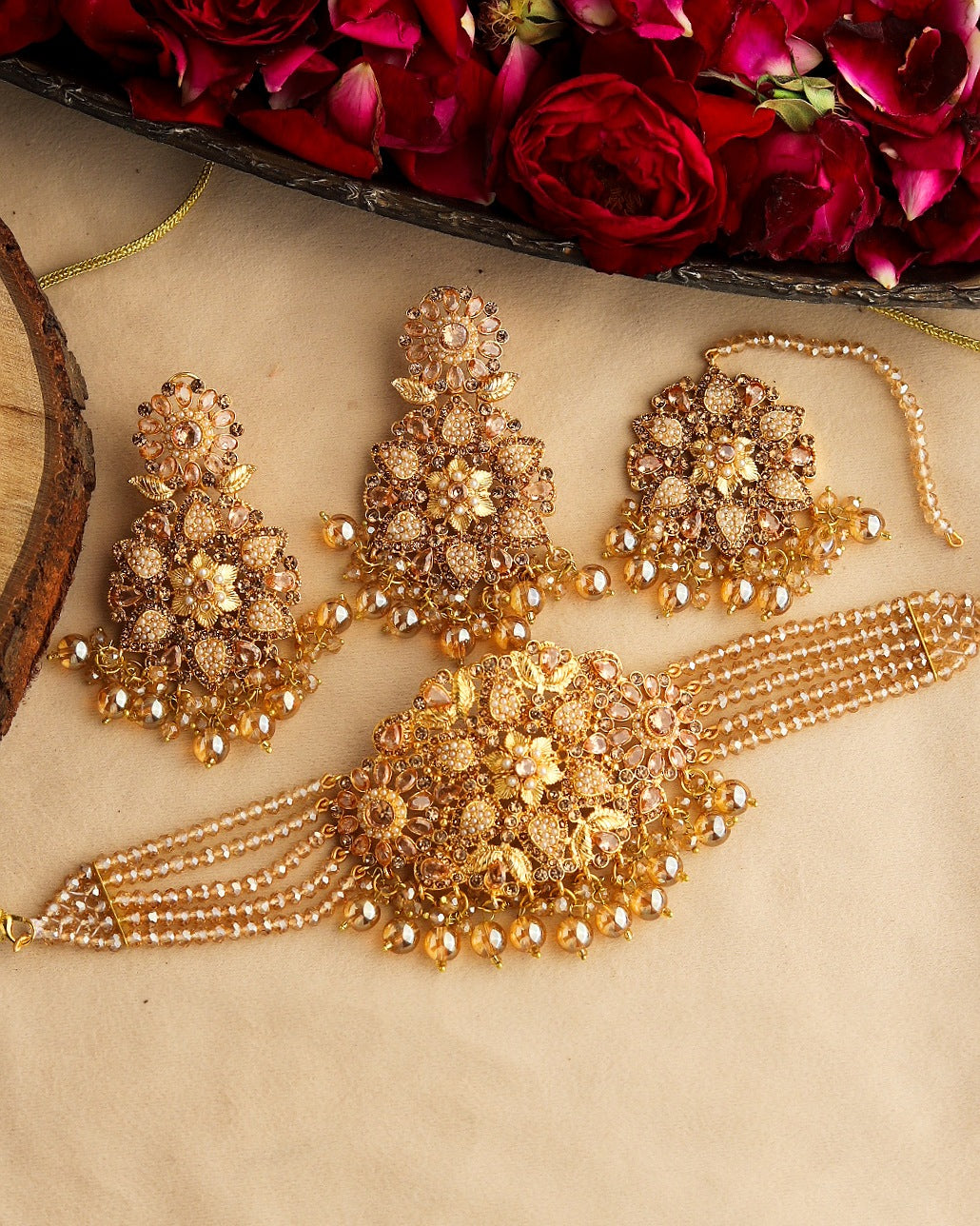 Traditional Choker Set Grace your neckline with this exquisite choker, paired with matching earrings for a royal ethnic look.