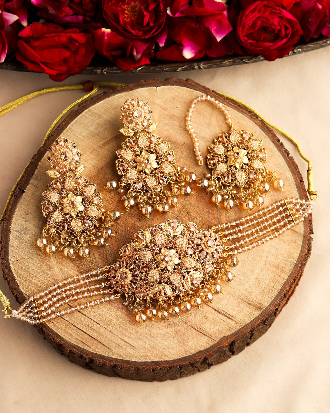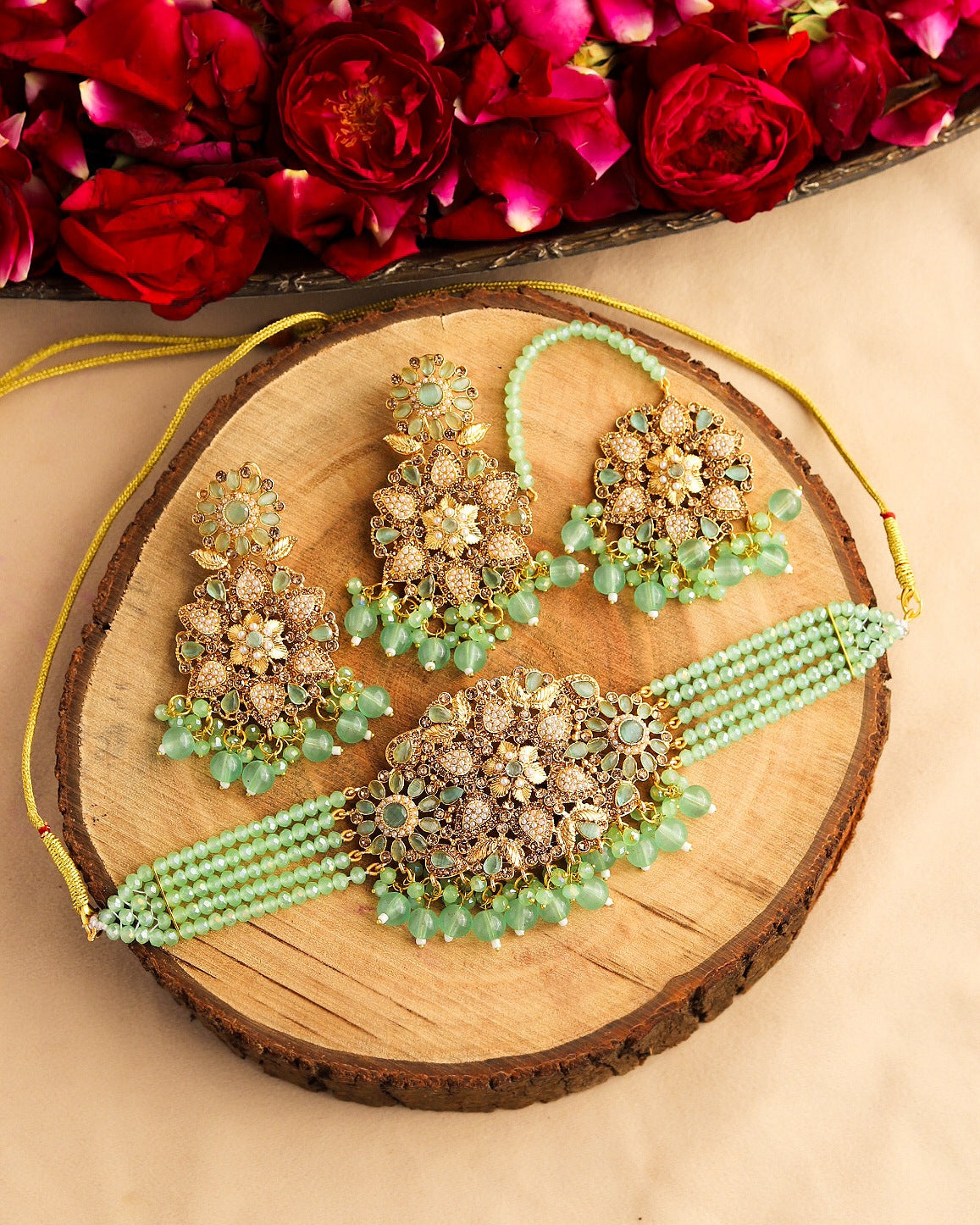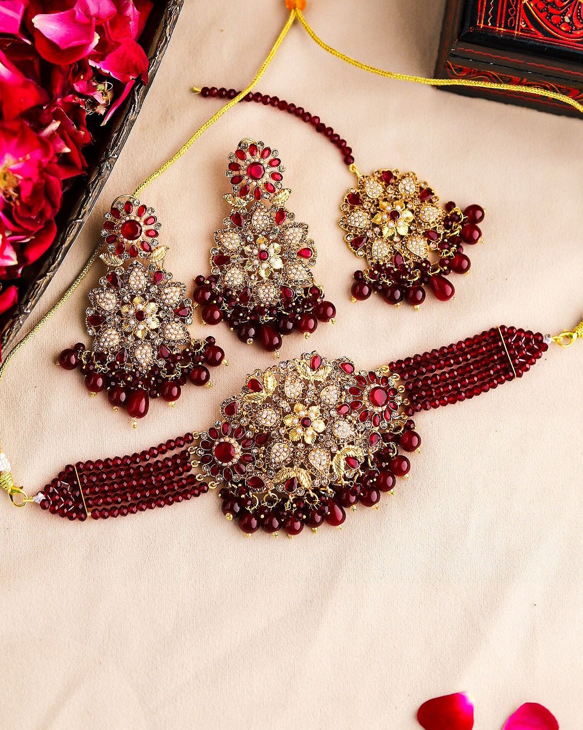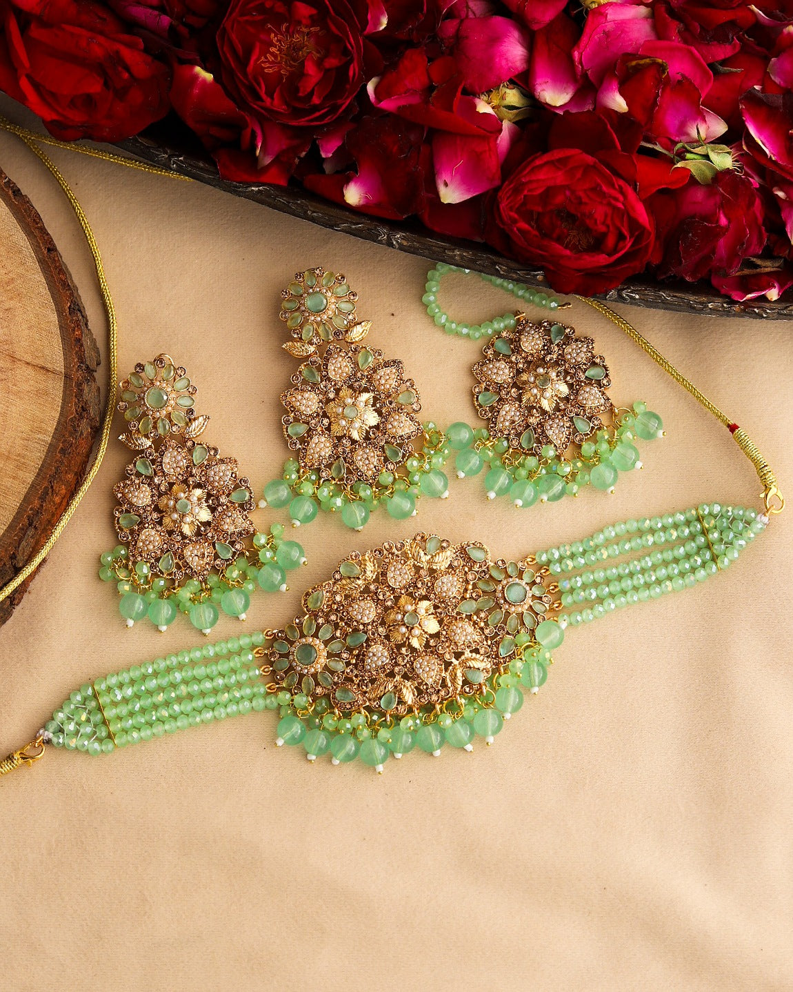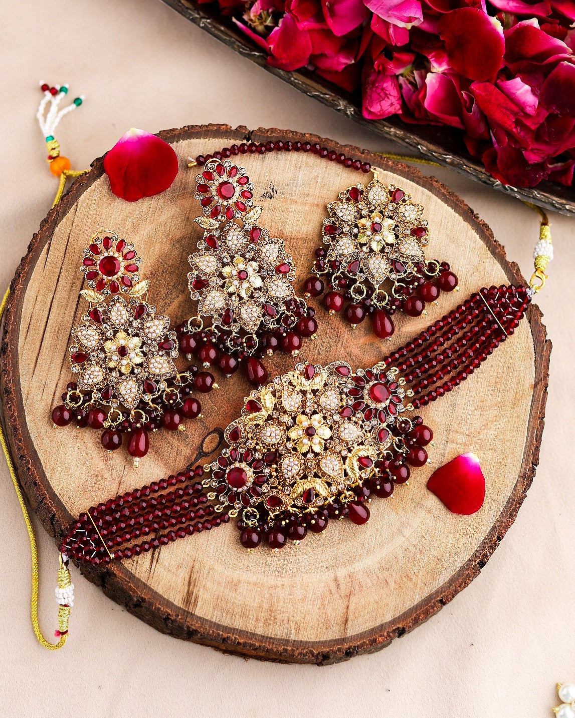 Traditional Choker Set Grace your neckline with this exquisite choker, paired with matching earrings for a royal ethnic look.