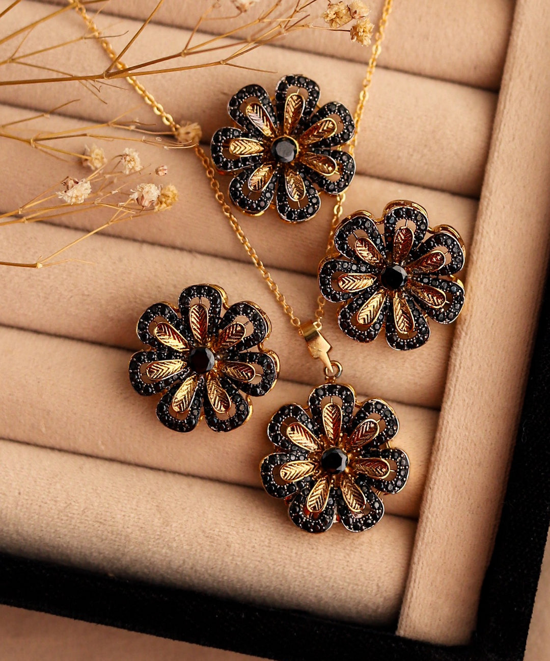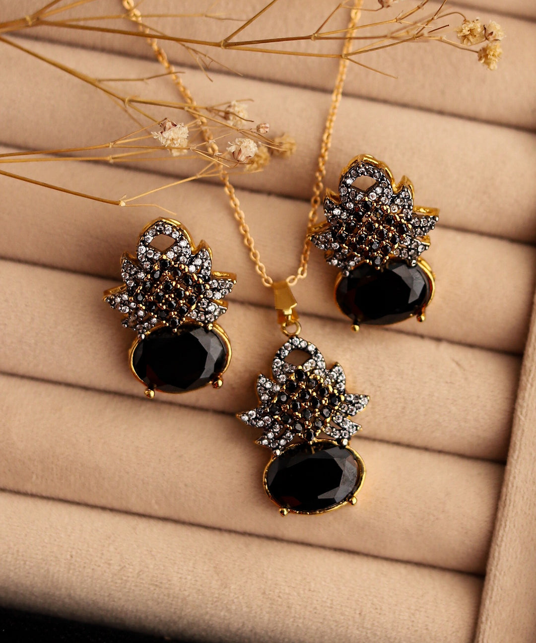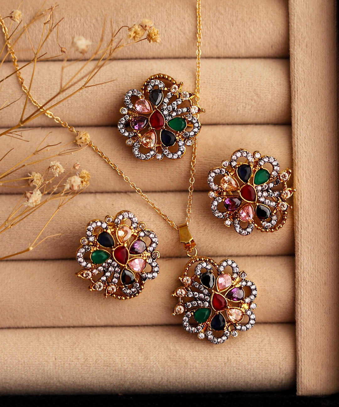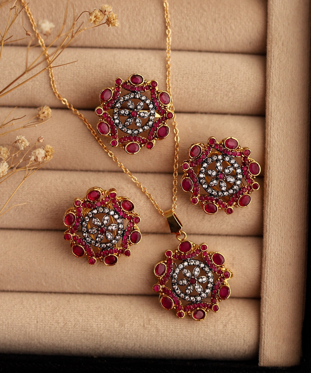 Radiating traditional charm, this jewelry combo set features a stunning pendant matching earrings and ring adorned with sparkling stones and deep red accents. Perfect for festive occasions, its intricate floral design adds timeless elegance to any look.