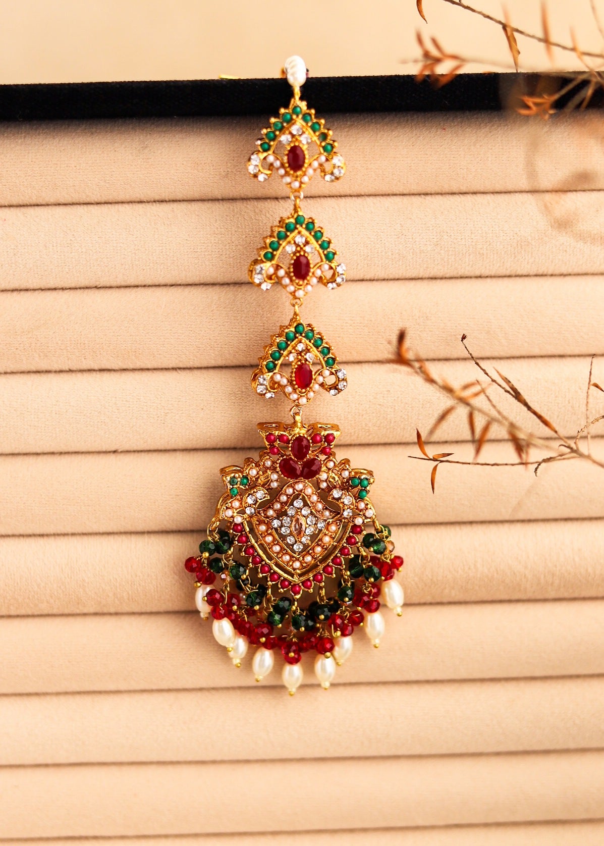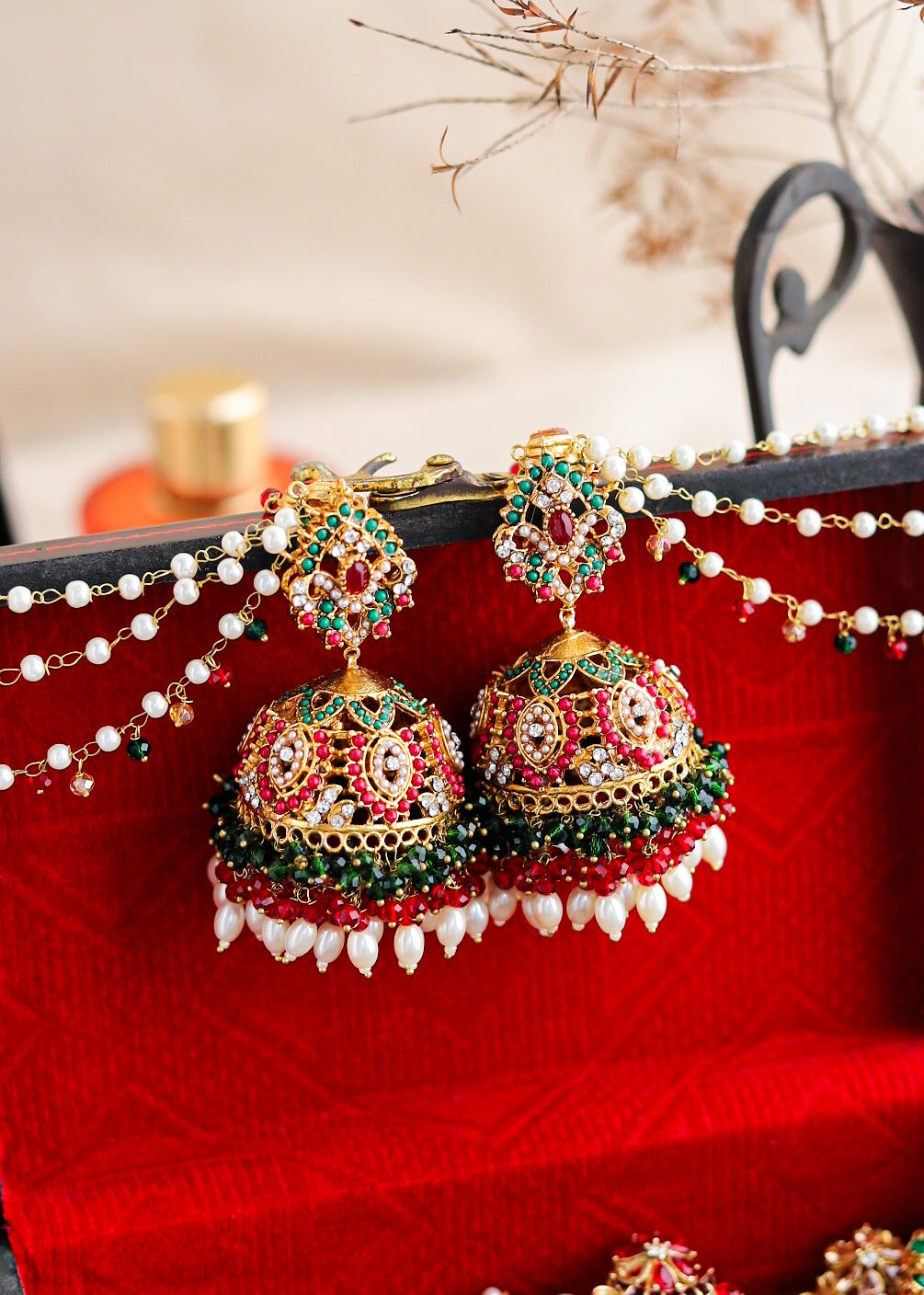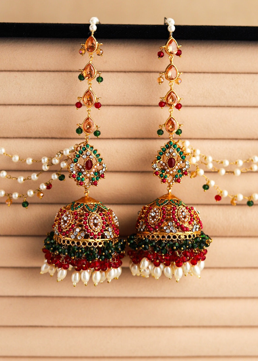 “Eternal charm of traditional jhumkas with elegant bindi earrings for a royal touch.” “Where timeless tradition meets graceful beauty – perfect for every festive moment.”
