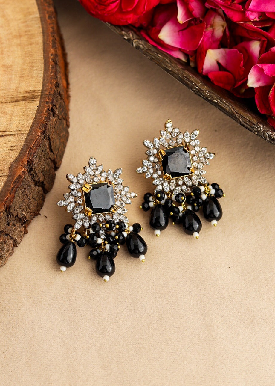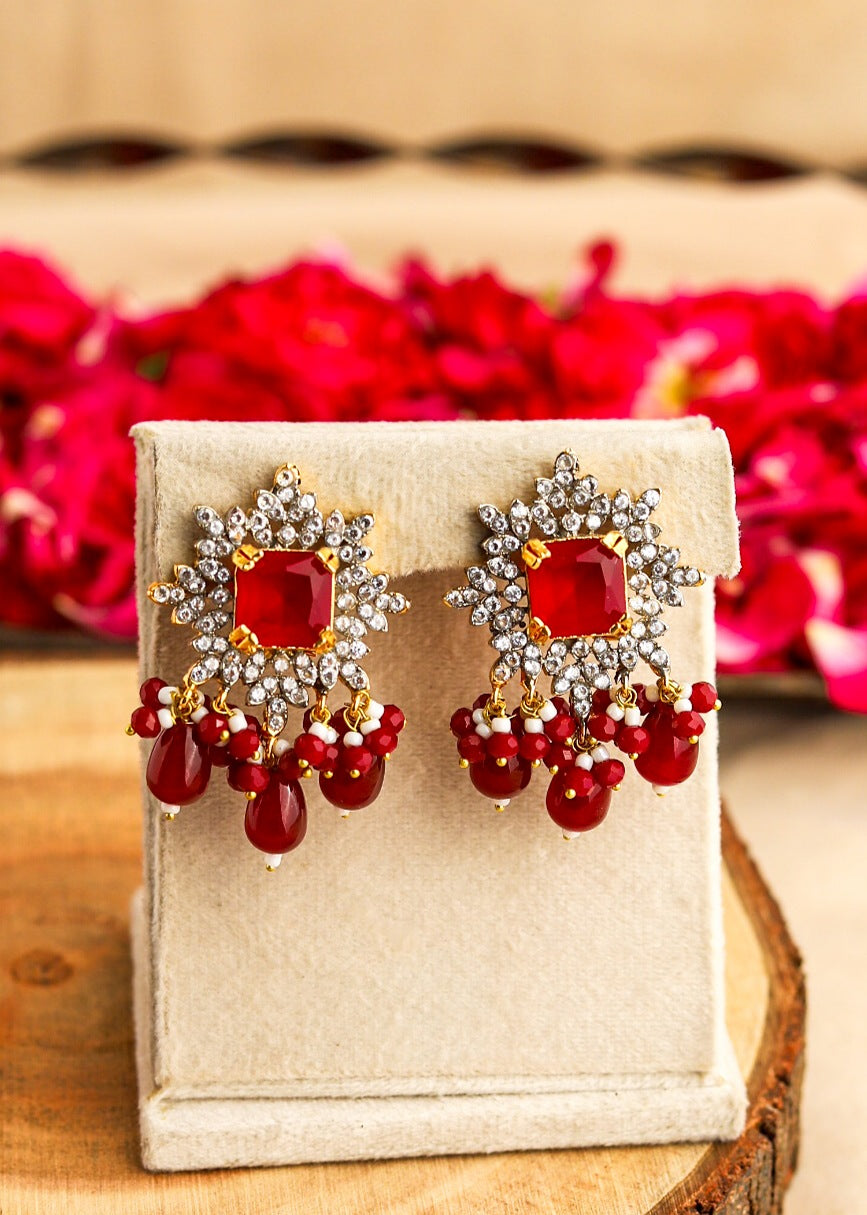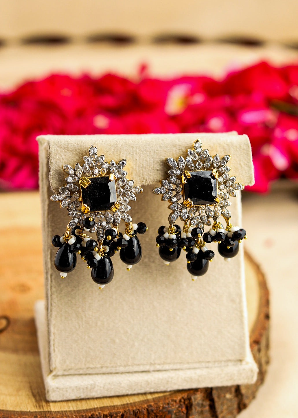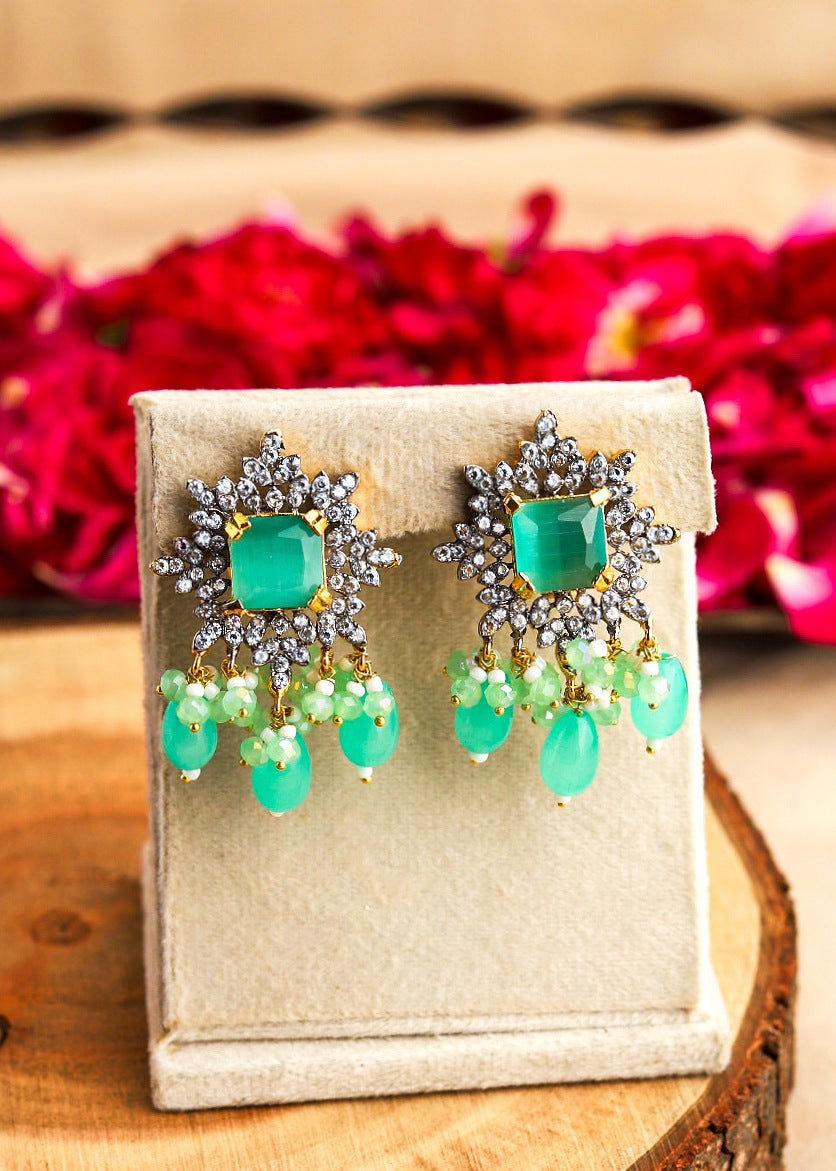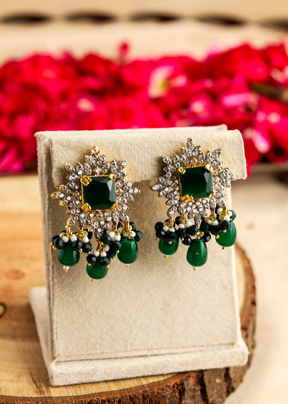 Elegant earrings adorned with sparkling stones and delicate beadwork, offering a perfect blend of glamour and tradition. Intricate craftsmanship adds charm and a touch of ethnic grace to any outfit. Ideal for festive occasions, weddings, or cultural celebrations.