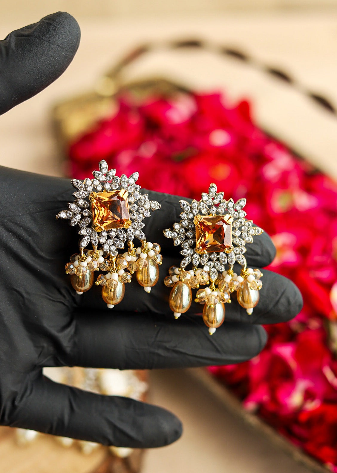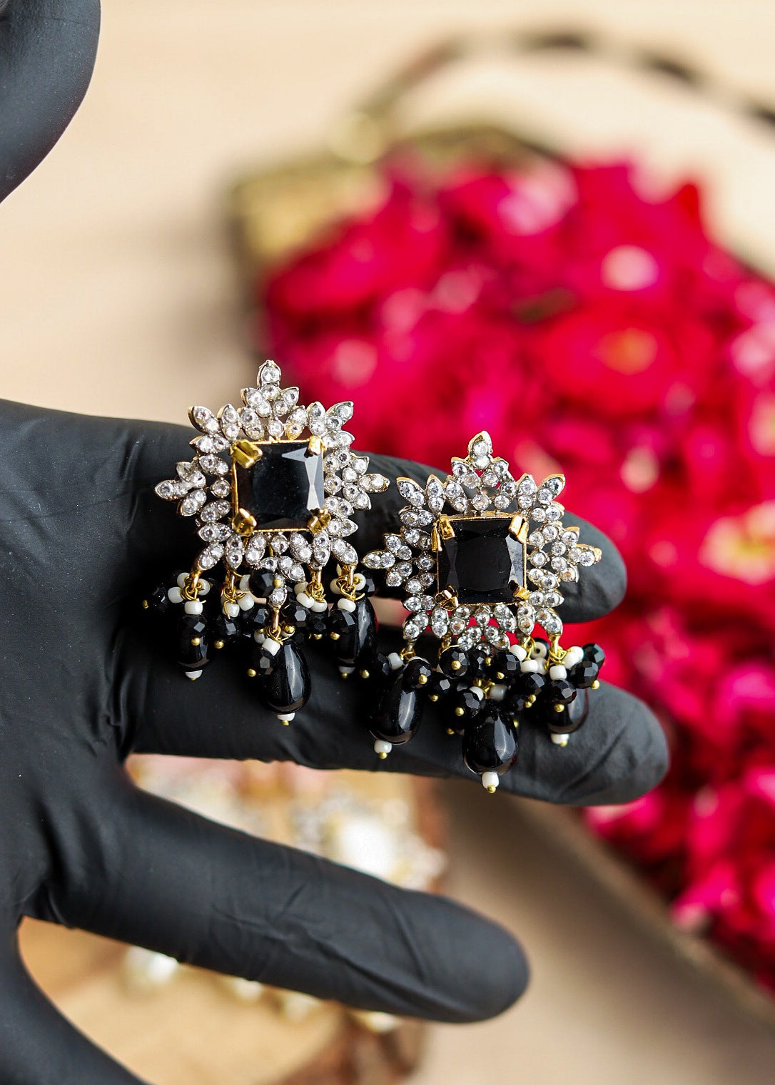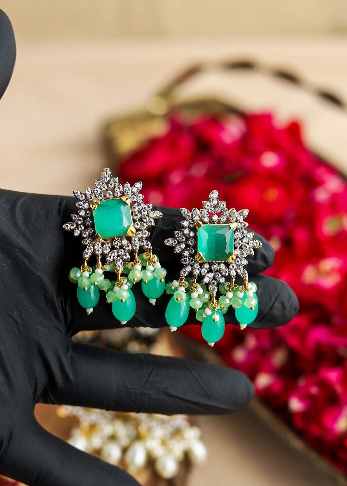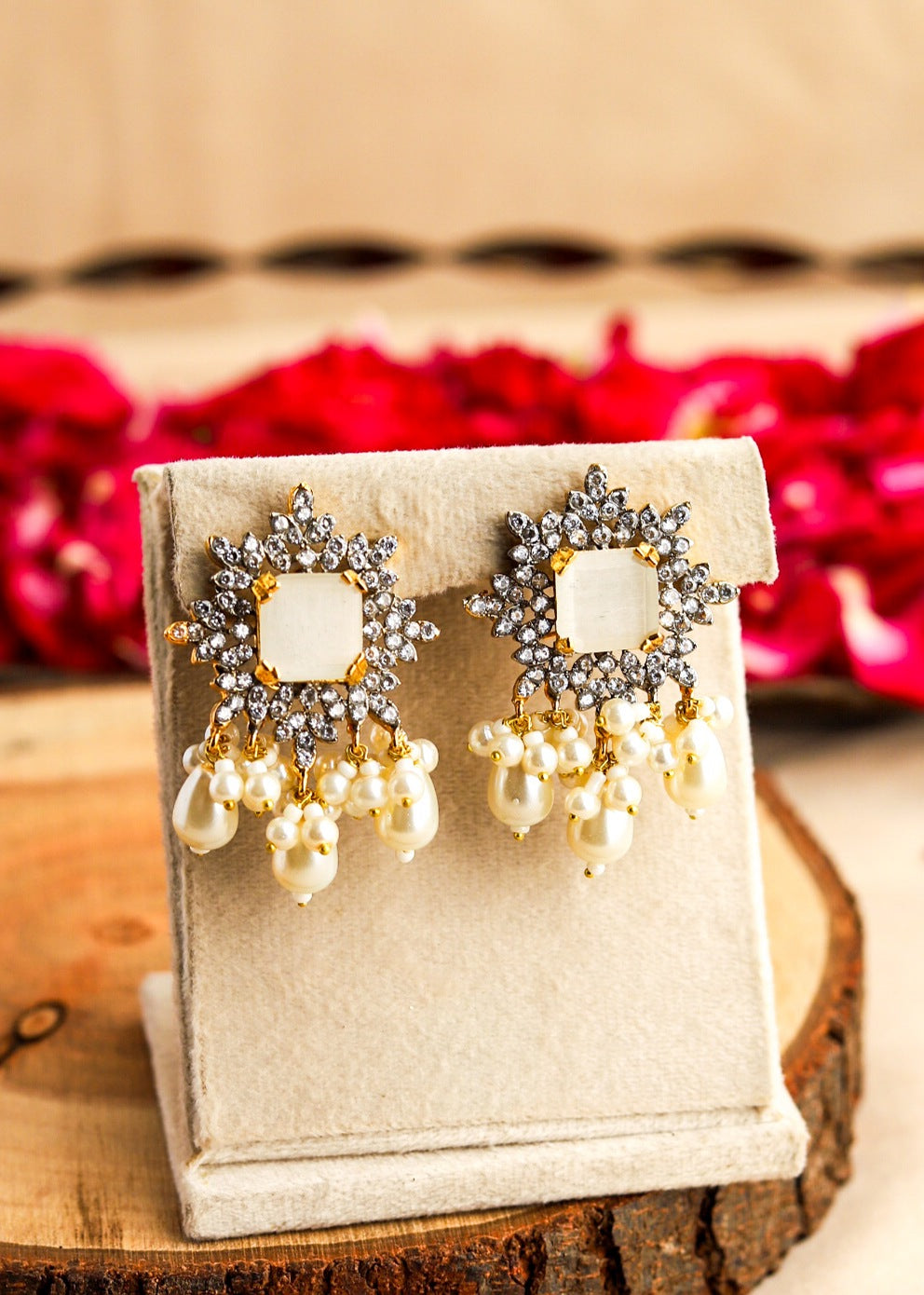 Elegant earrings adorned with sparkling stones and delicate beadwork, offering a perfect blend of glamour and tradition. Intricate craftsmanship adds charm and a touch of ethnic grace to any outfit. Ideal for festive occasions, weddings, or cultural celebrations.
