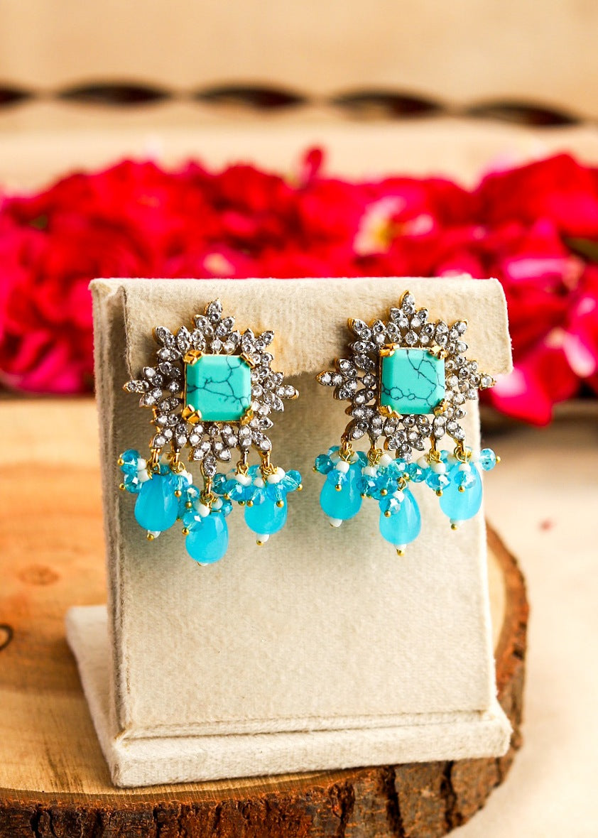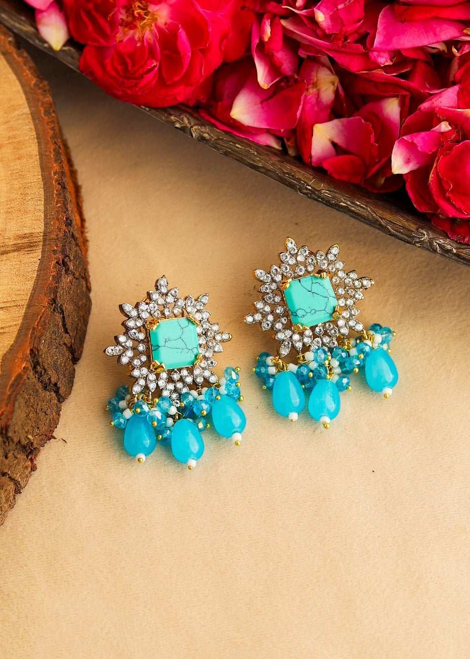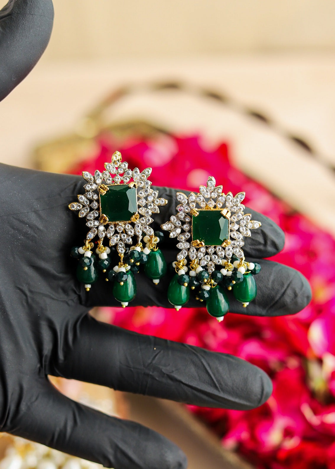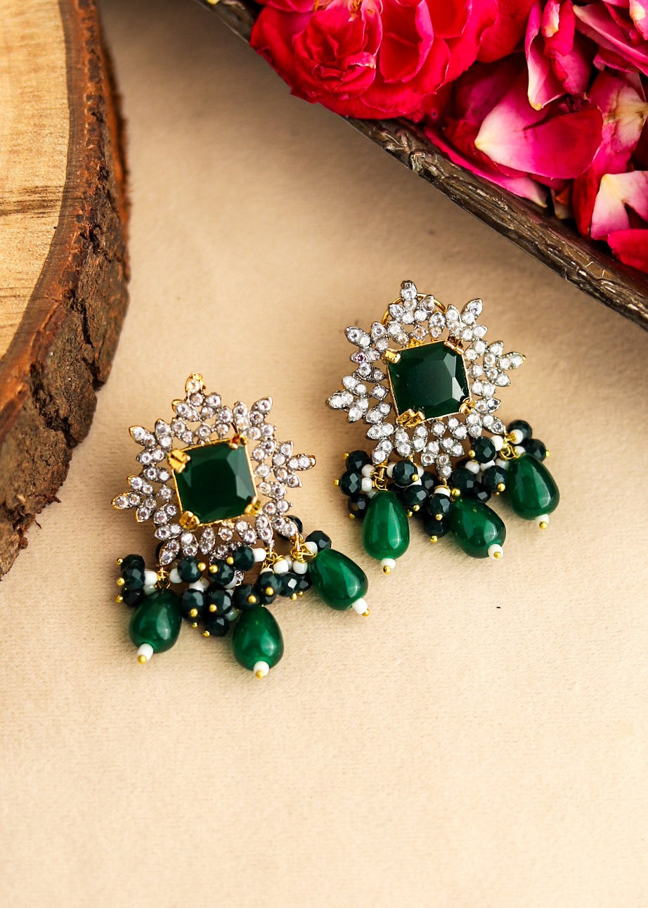 Elegant earrings adorned with sparkling stones and delicate beadwork, offering a perfect blend of glamour and tradition. Intricate craftsmanship adds charm and a touch of ethnic grace to any outfit. Ideal for festive occasions, weddings, or cultural celebrations.