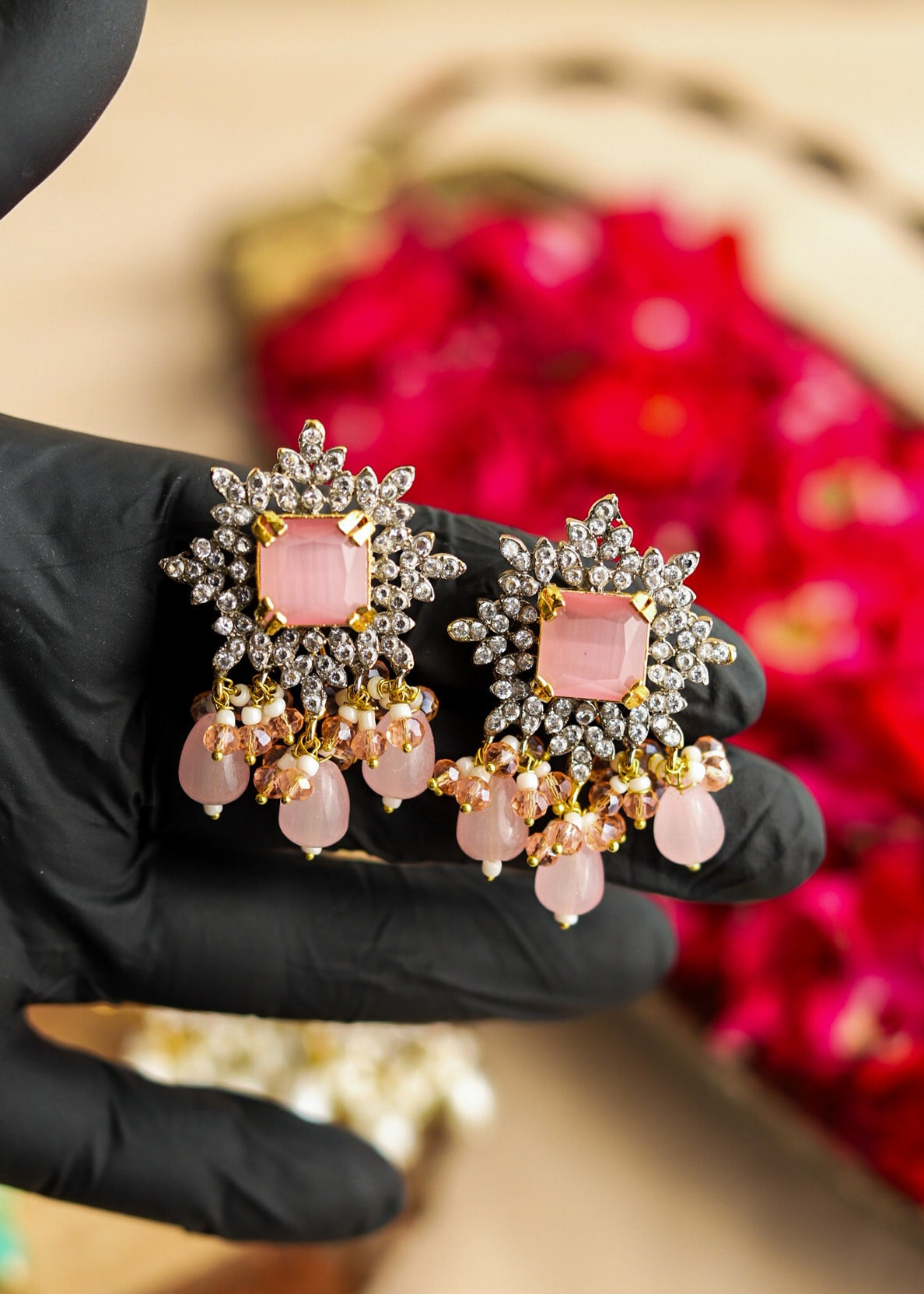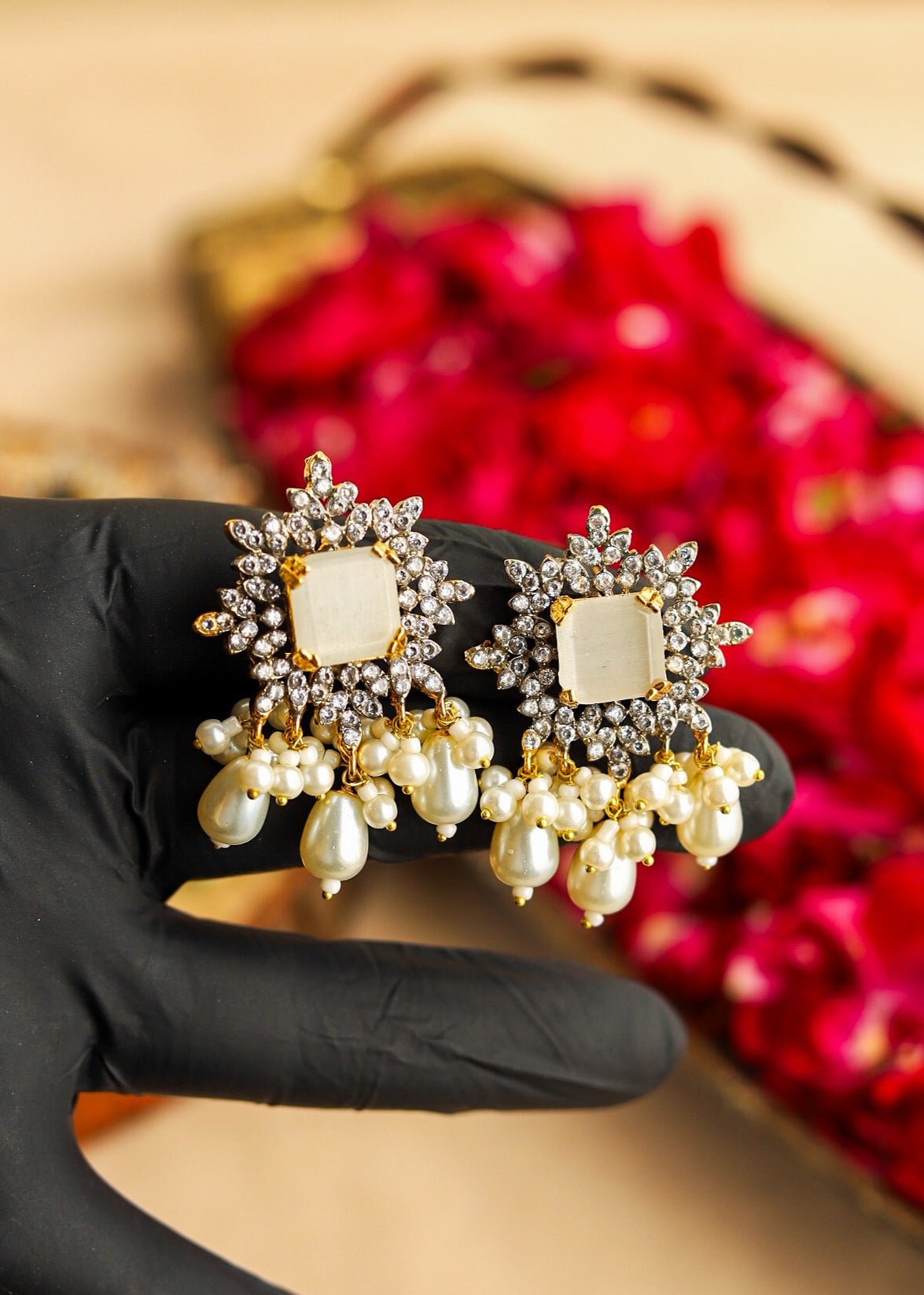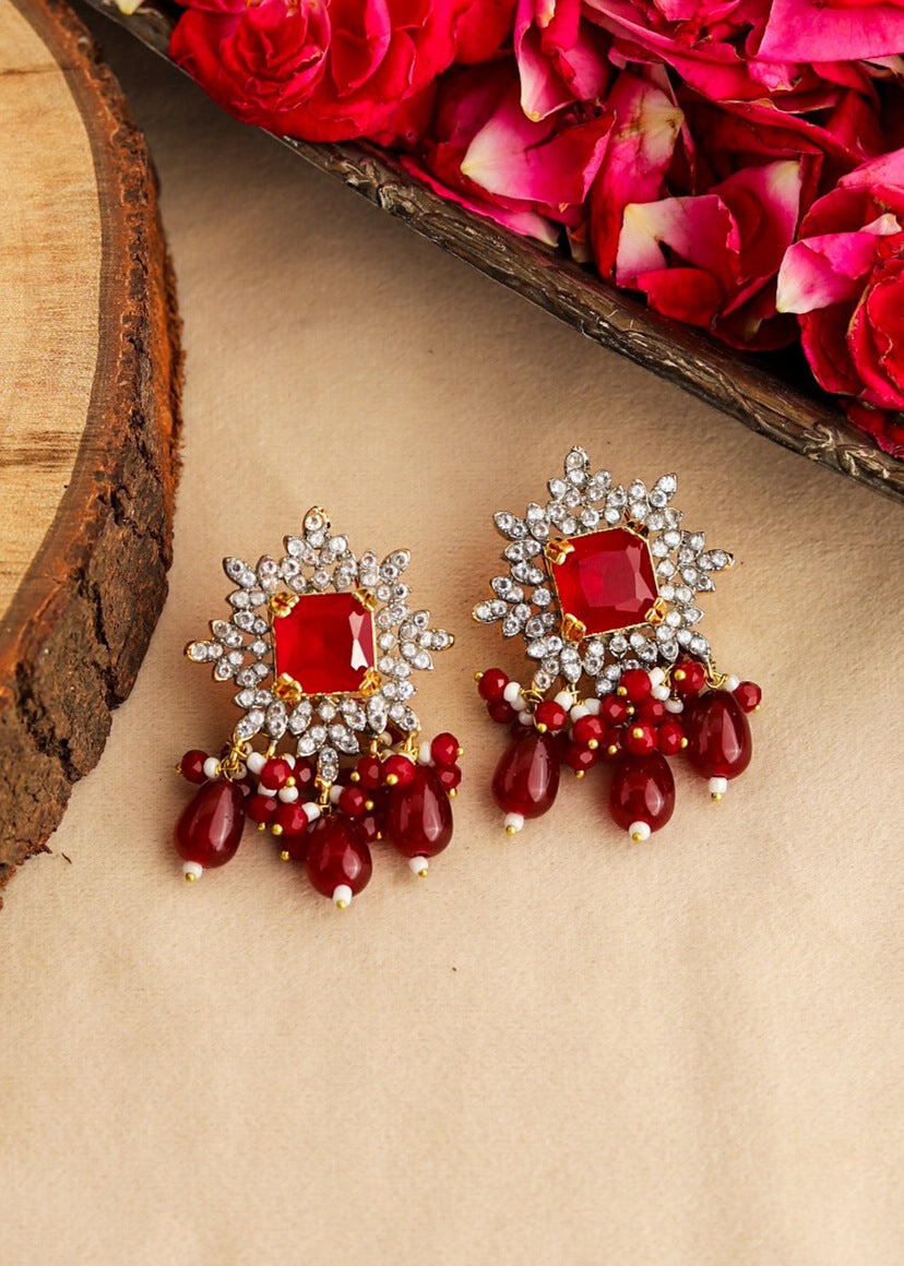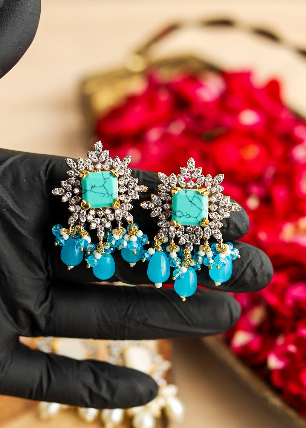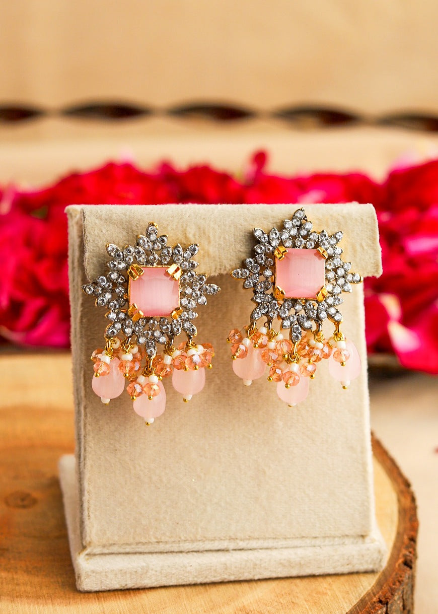 Elegant earrings adorned with sparkling stones and delicate beadwork, offering a perfect blend of glamour and tradition. Intricate craftsmanship adds charm and a touch of ethnic grace to any outfit. Ideal for festive occasions, weddings, or cultural celebrations.