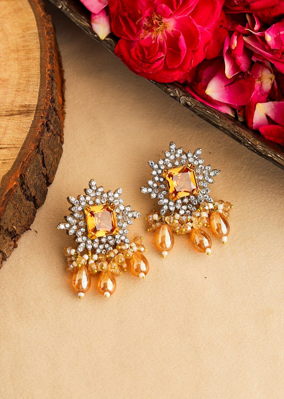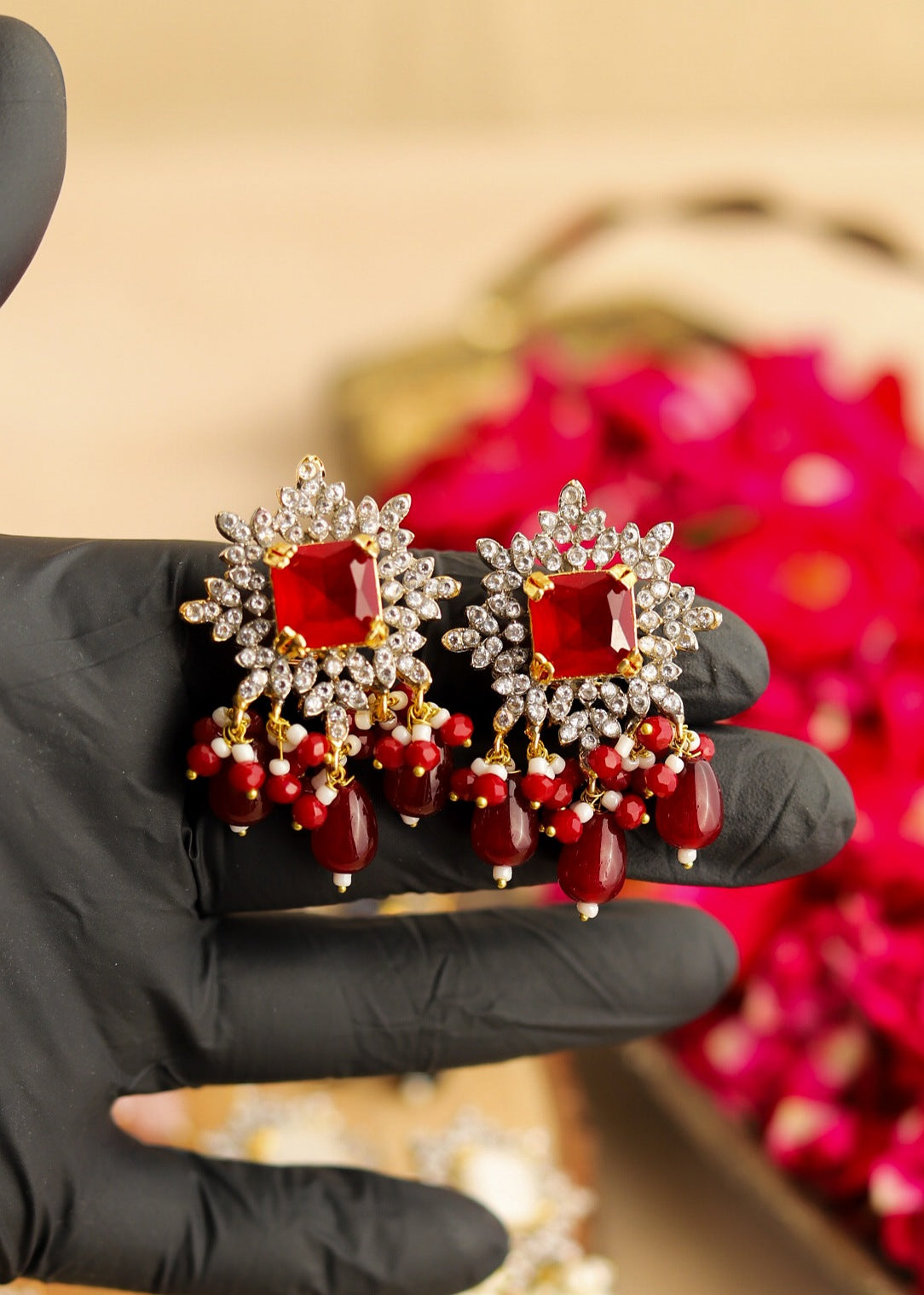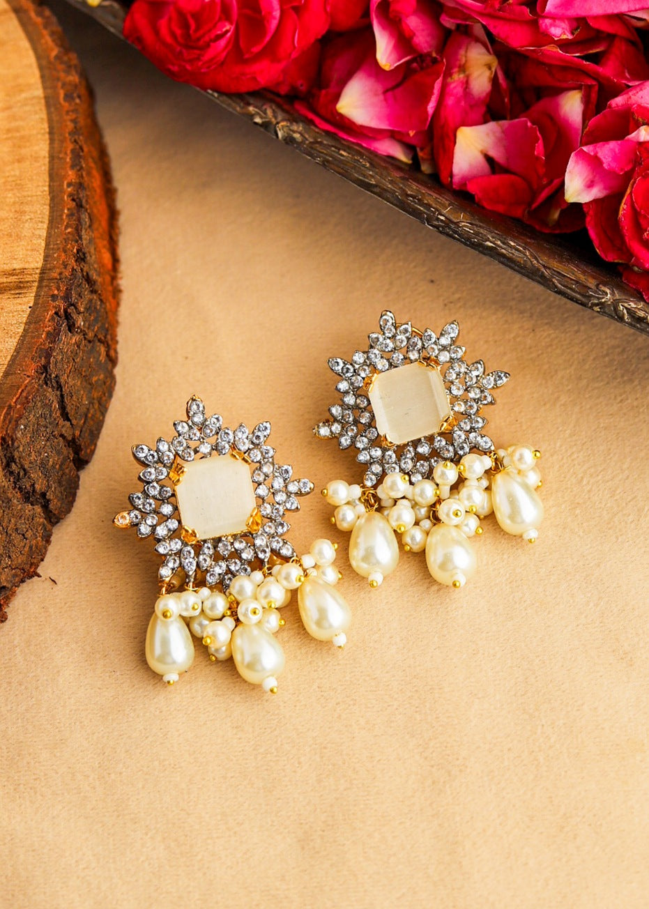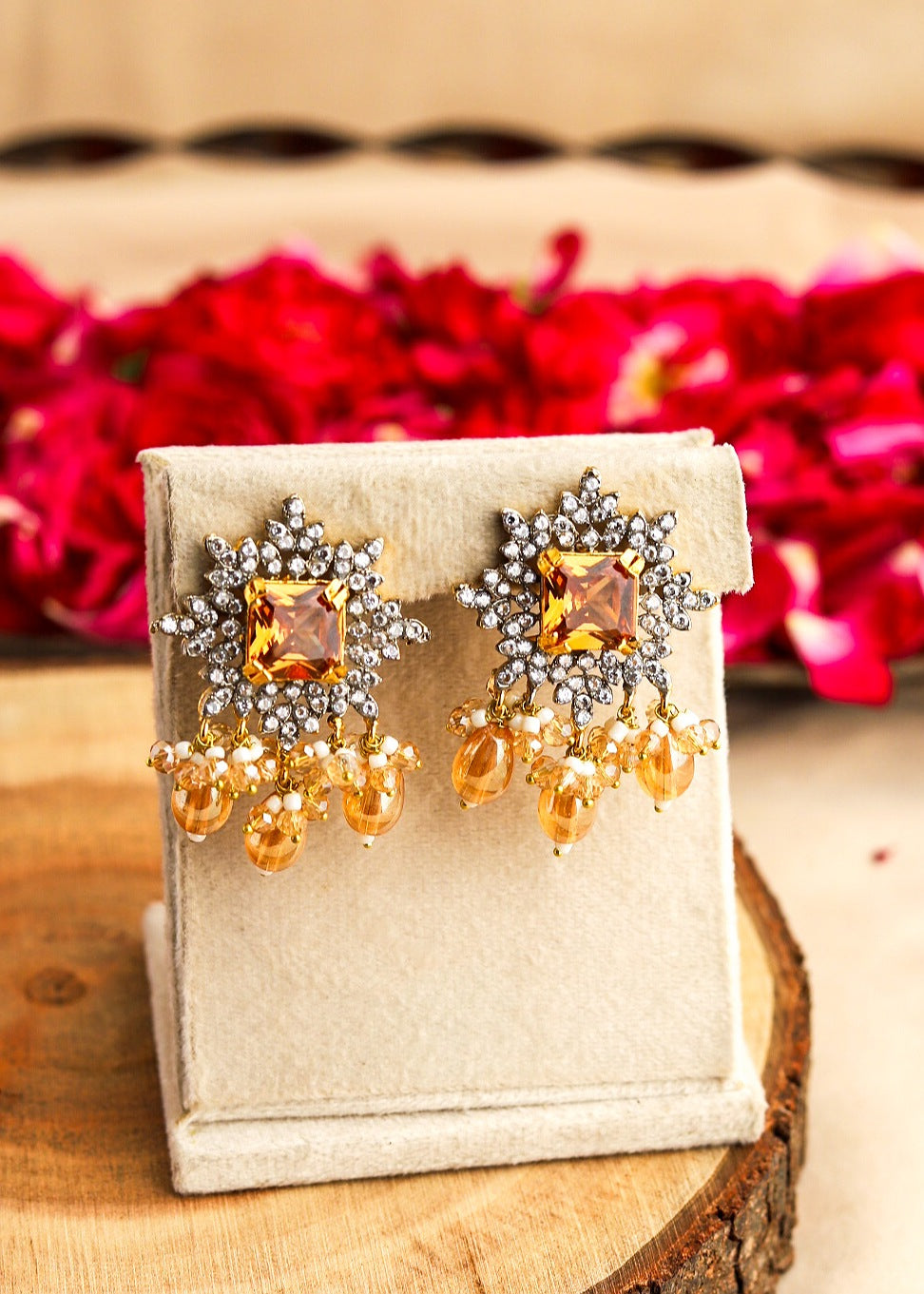 Elegant earrings adorned with sparkling stones and delicate beadwork, offering a perfect blend of glamour and tradition. Intricate craftsmanship adds charm and a touch of ethnic grace to any outfit. Ideal for festive occasions, weddings, or cultural celebrations.