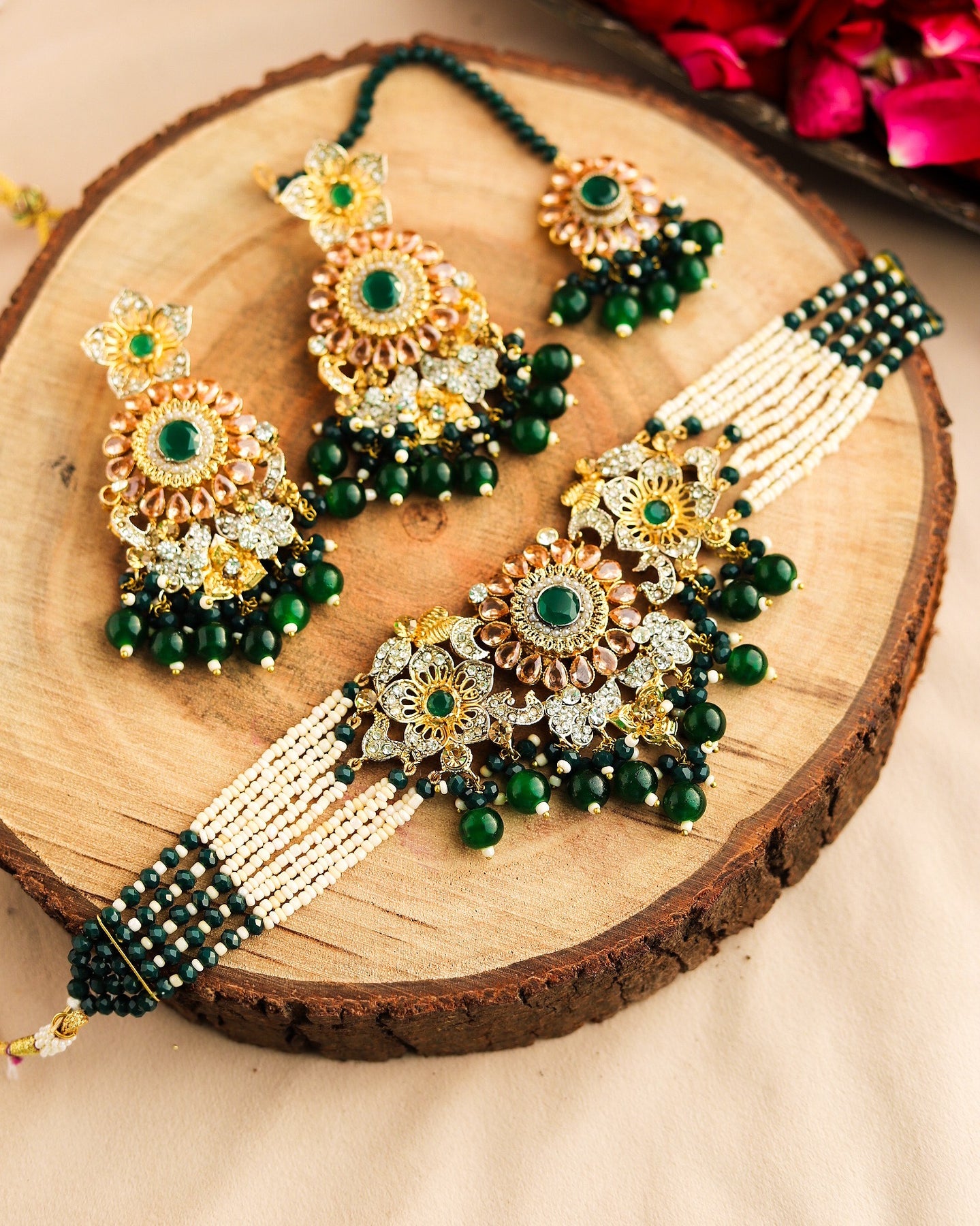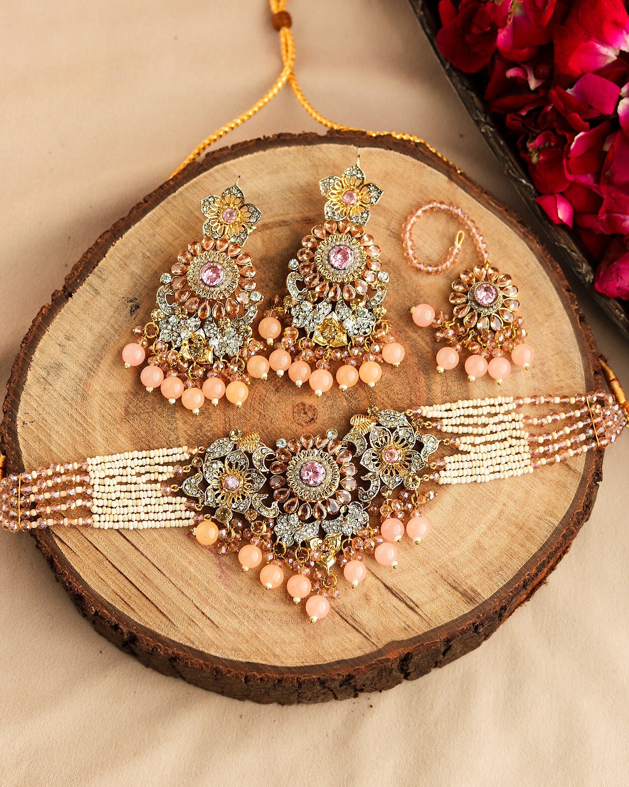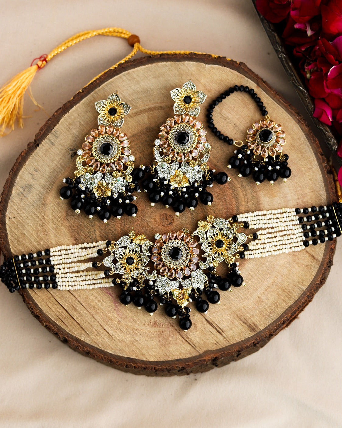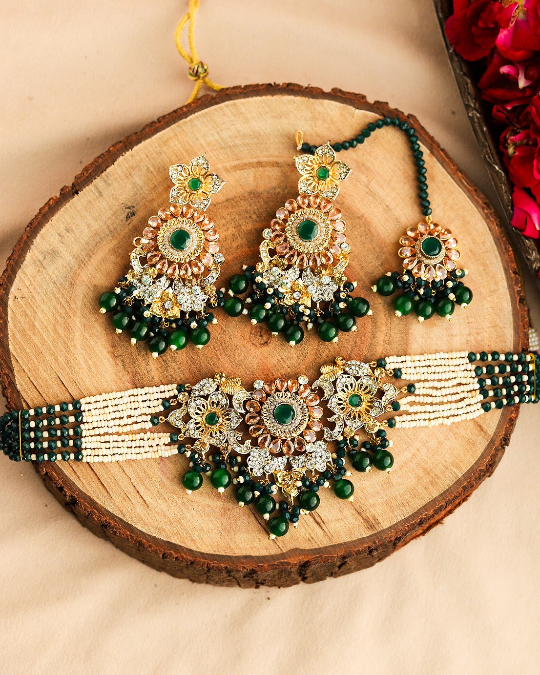 Elevate your ethnic look with this exquisite traditional choker set, crafted with intricate detailing. Perfect for weddings and festive occasions, it adds timeless elegance to any outfit.