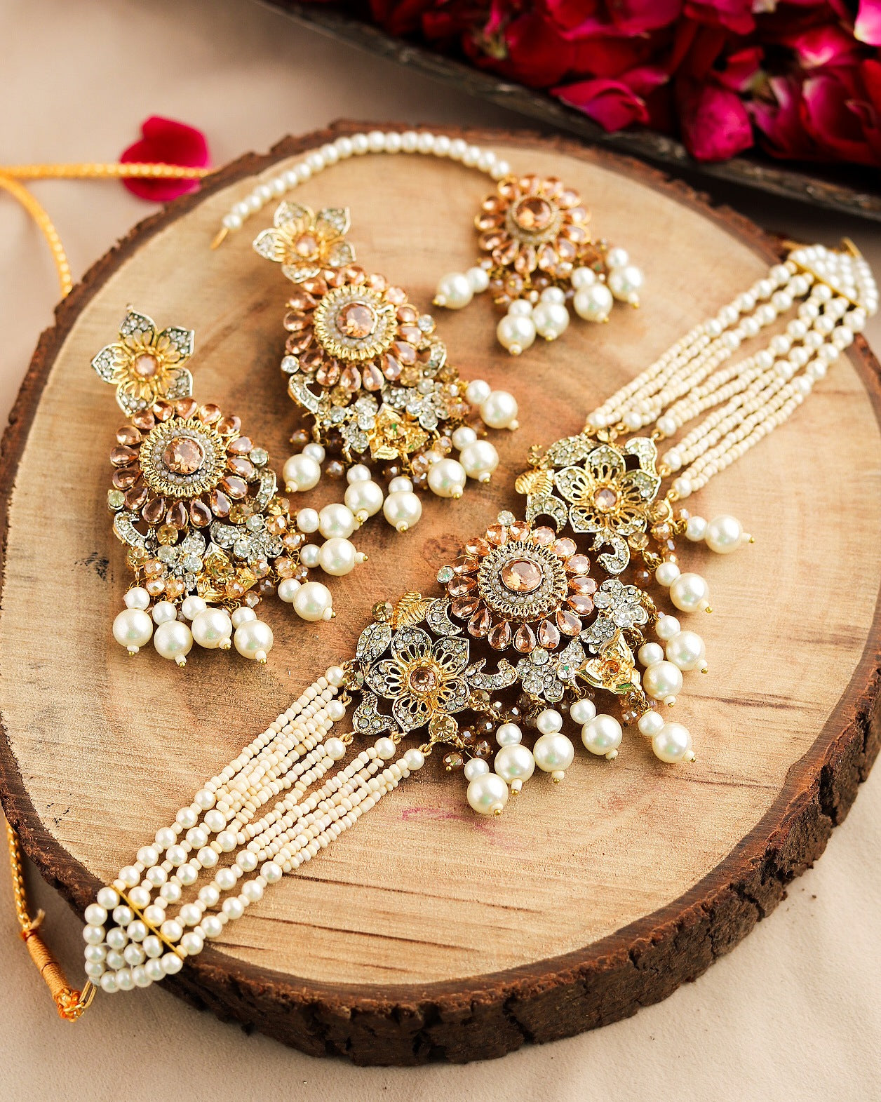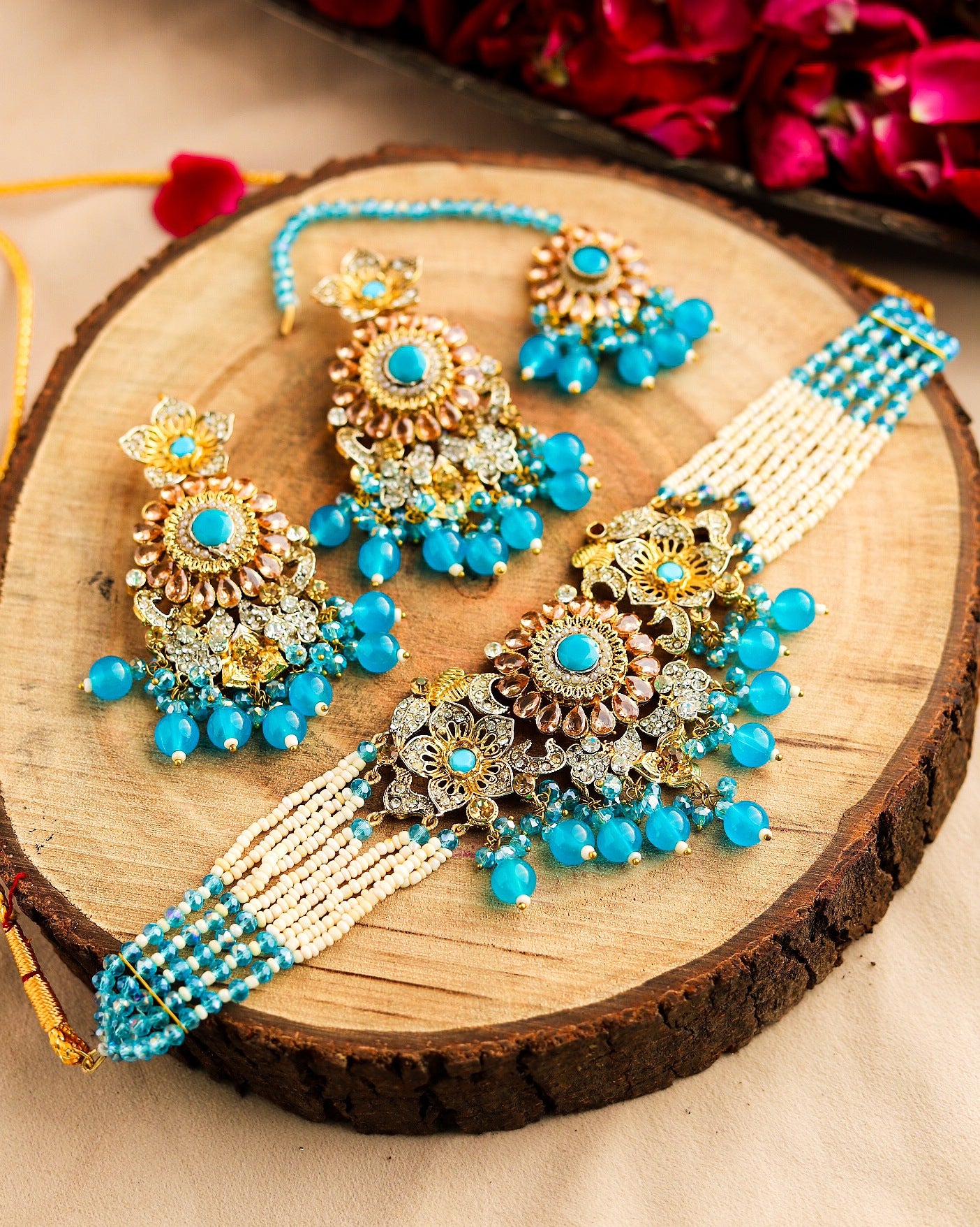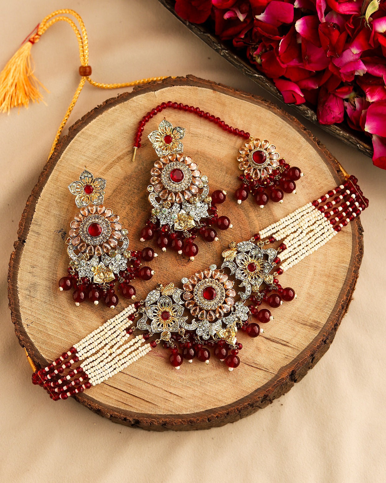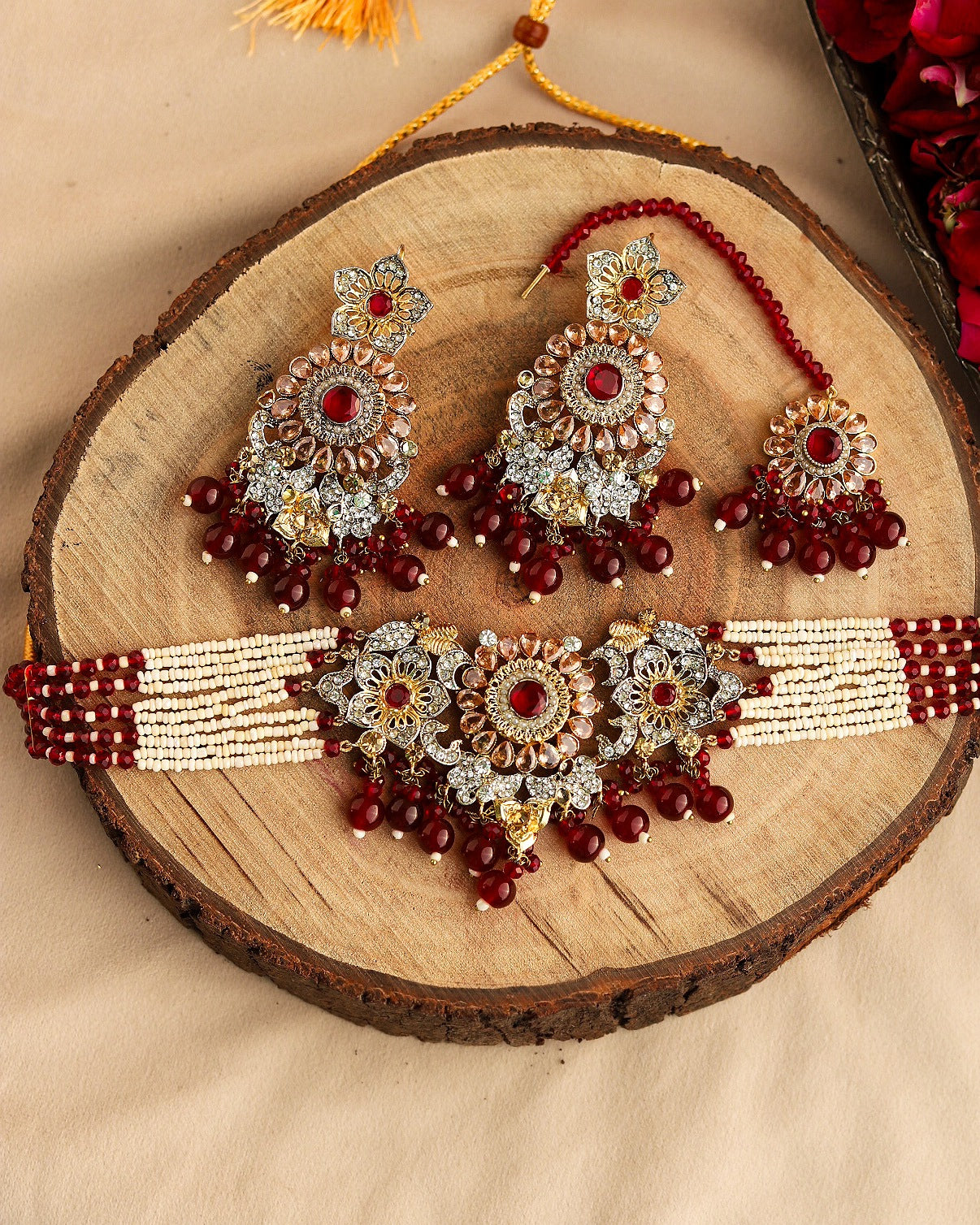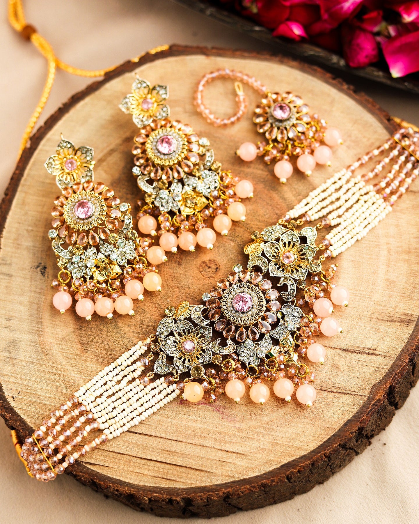 Elevate your ethnic look with this exquisite traditional choker set, crafted with intricate detailing. Perfect for weddings and festive occasions, it adds timeless elegance to any outfit.