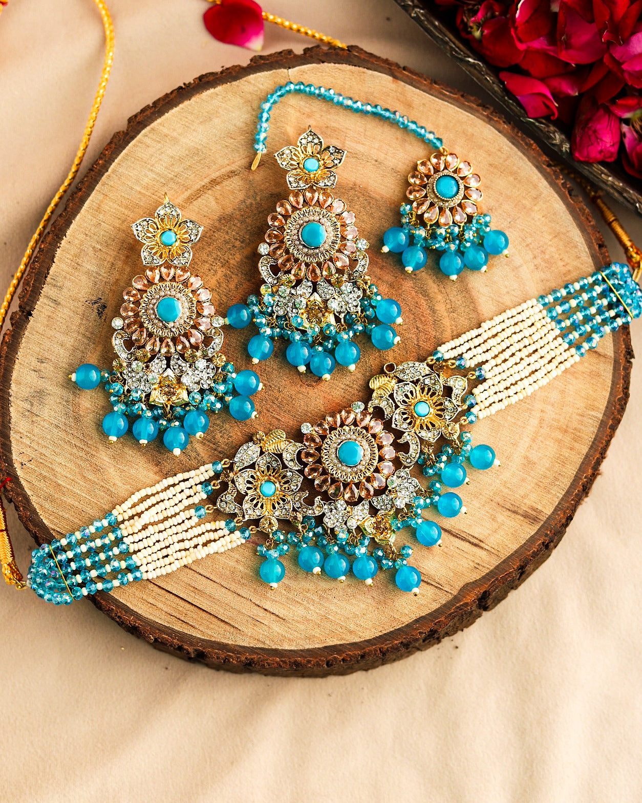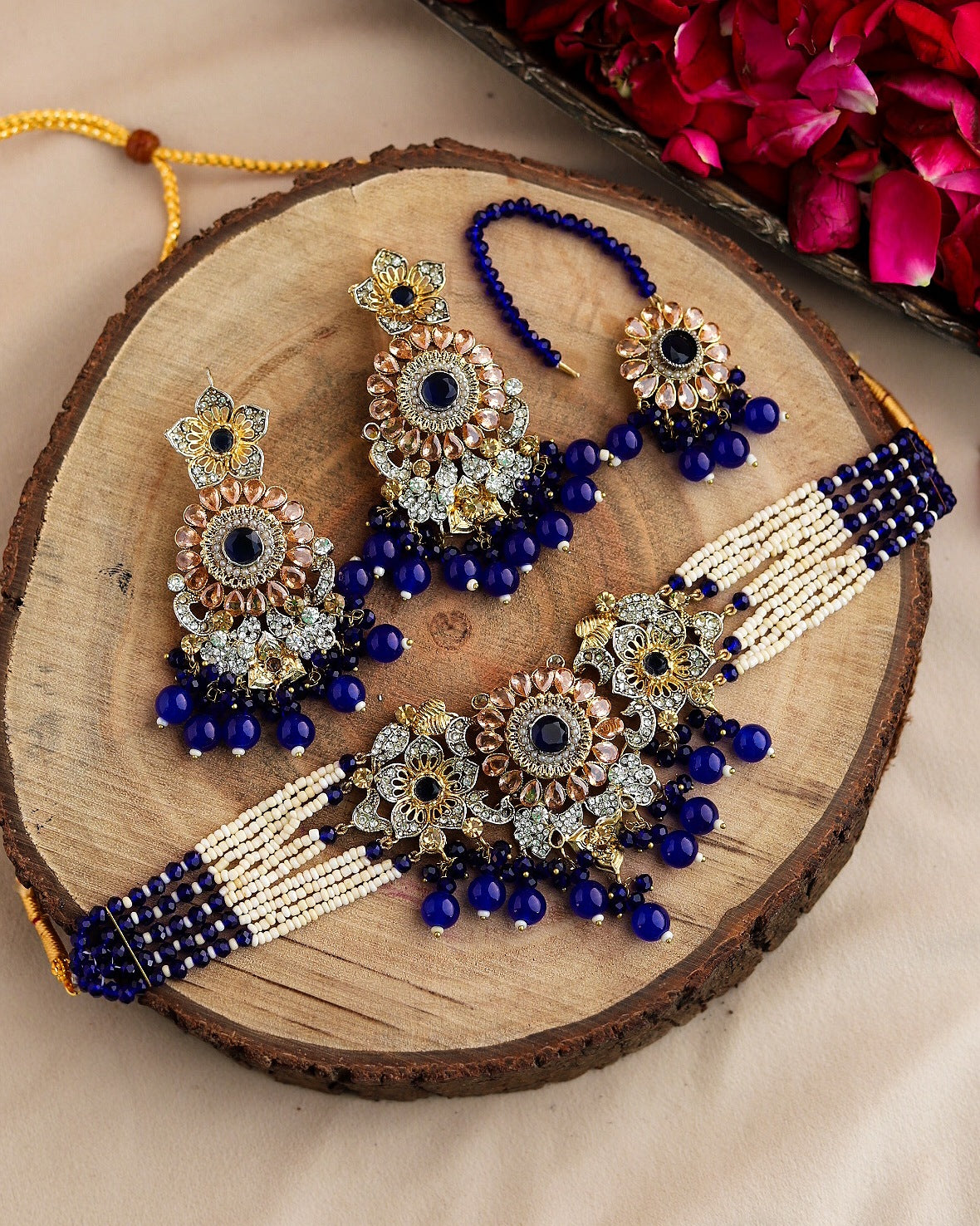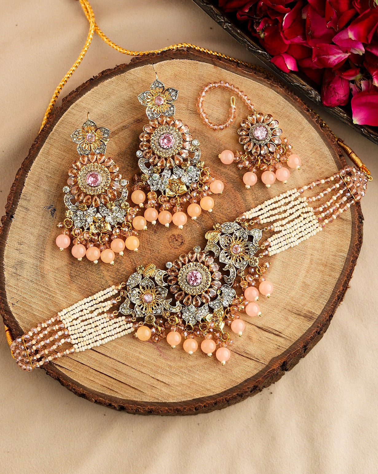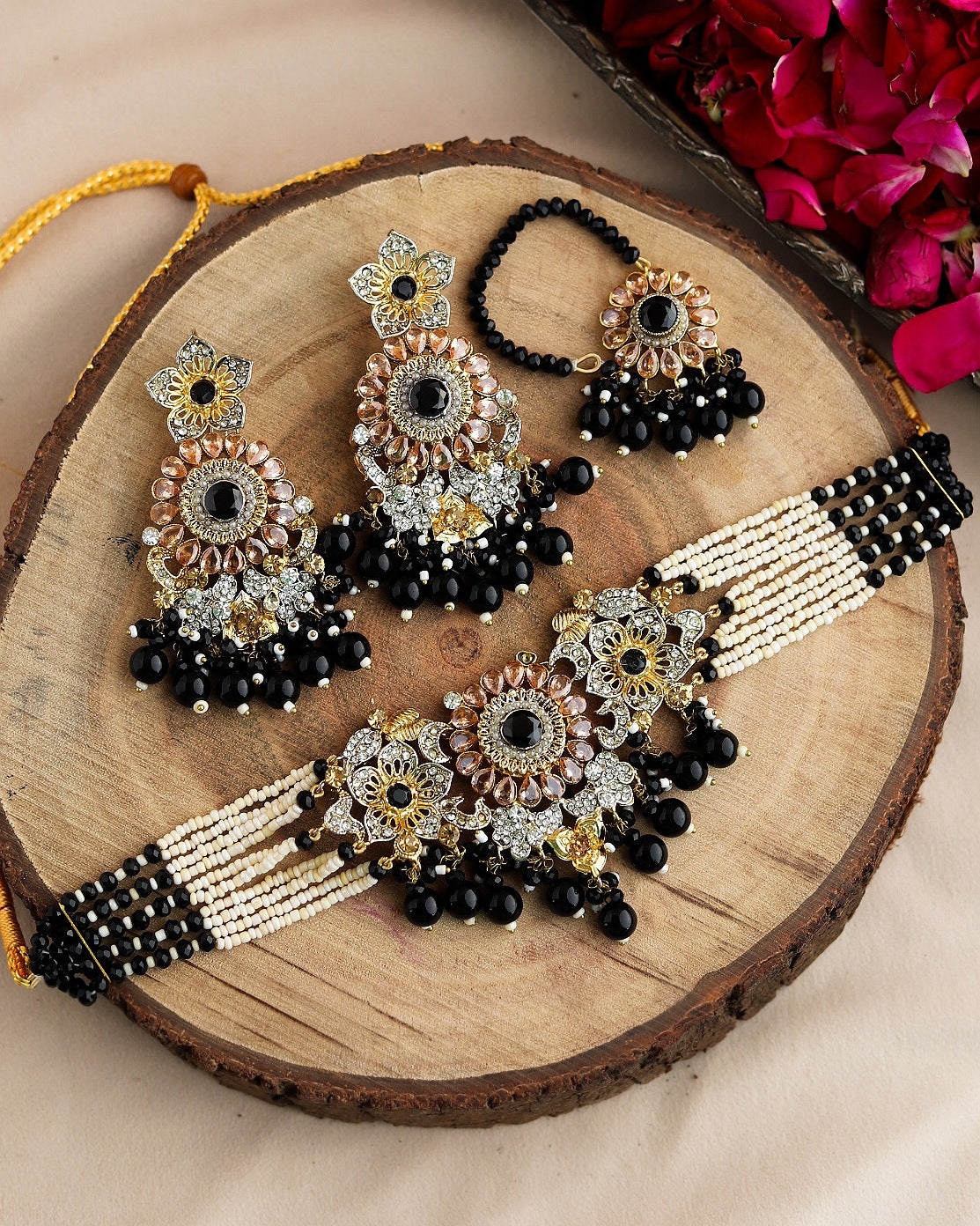 Elevate your ethnic look with this exquisite traditional choker set, crafted with intricate detailing. Perfect for weddings and festive occasions, it adds timeless elegance to any outfit.
