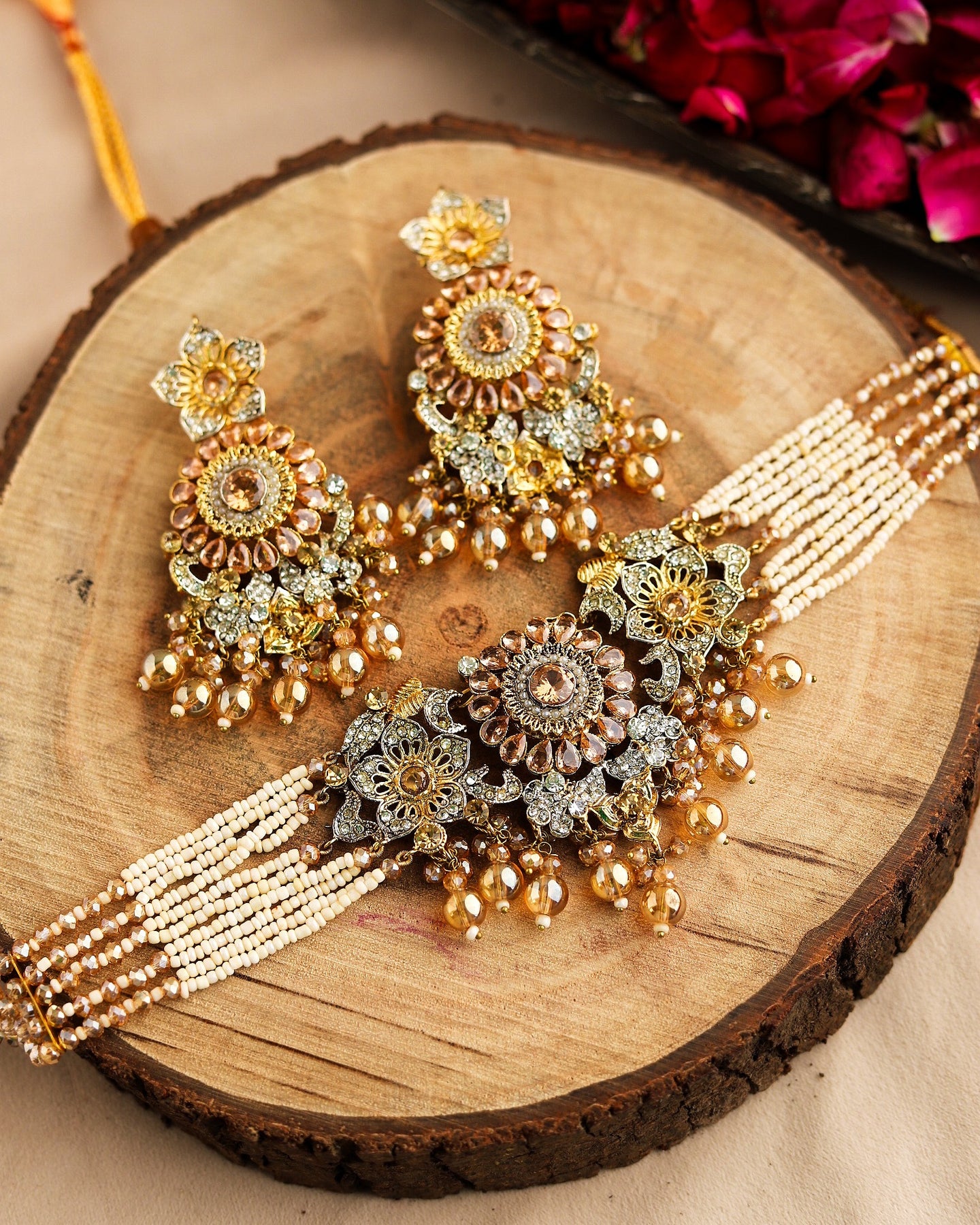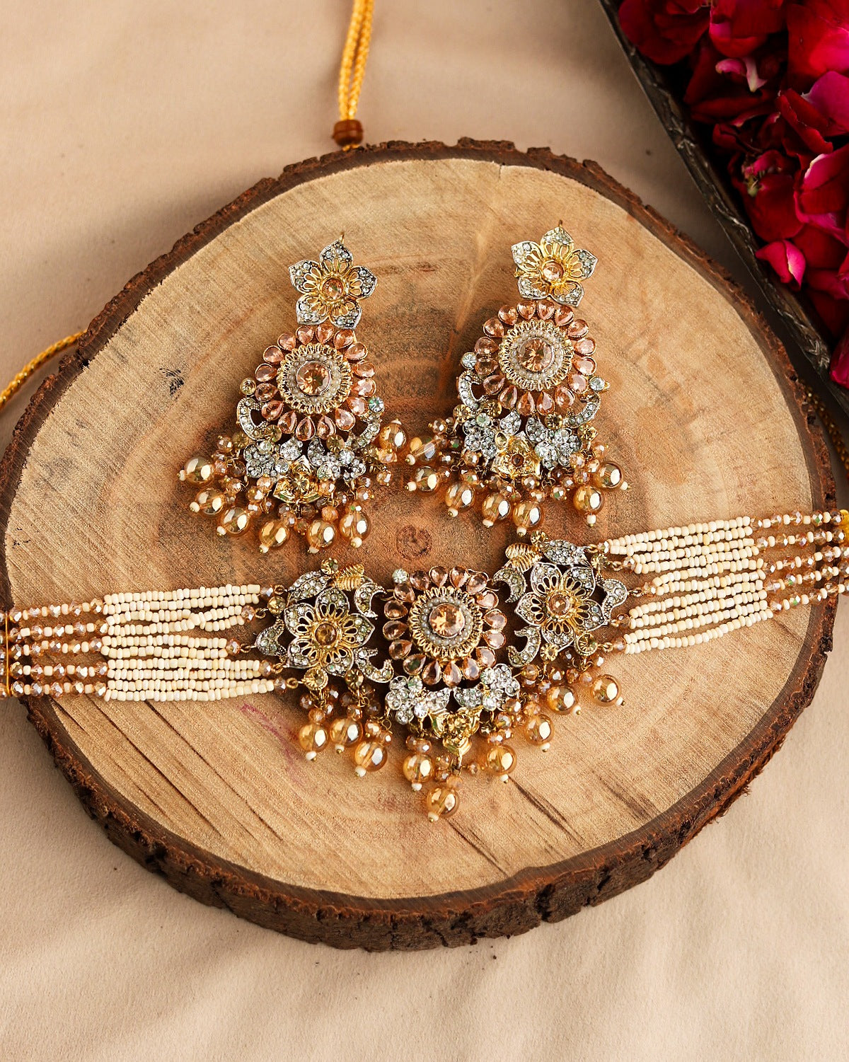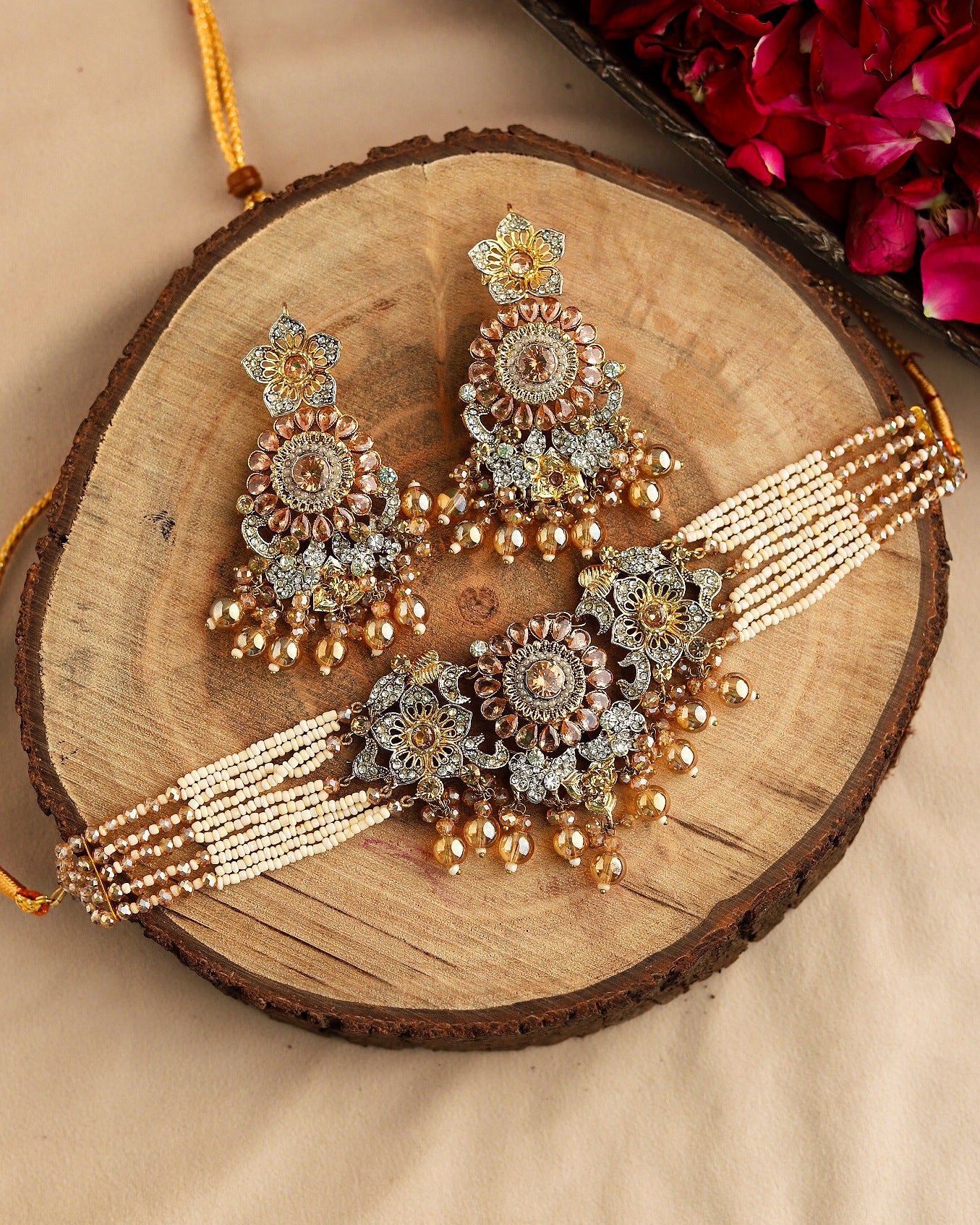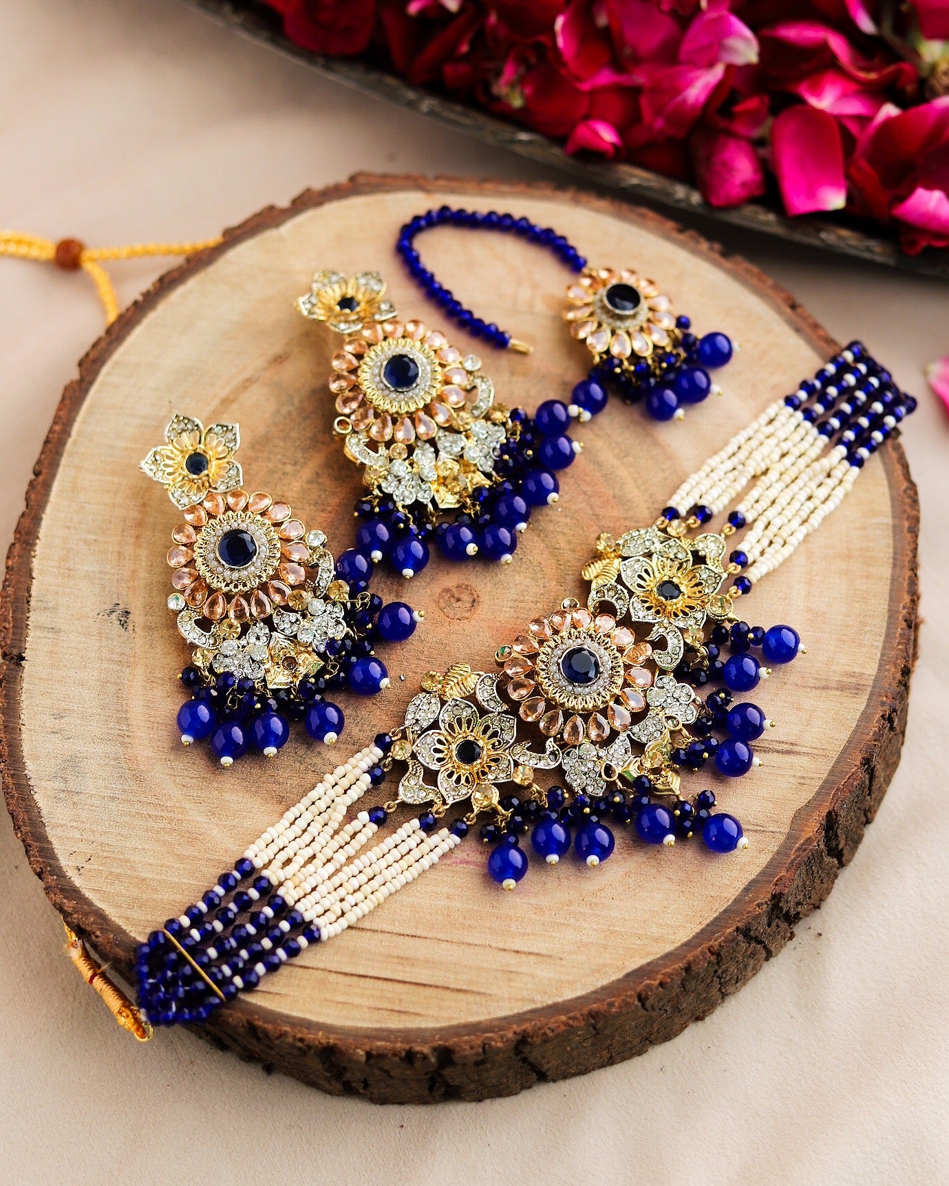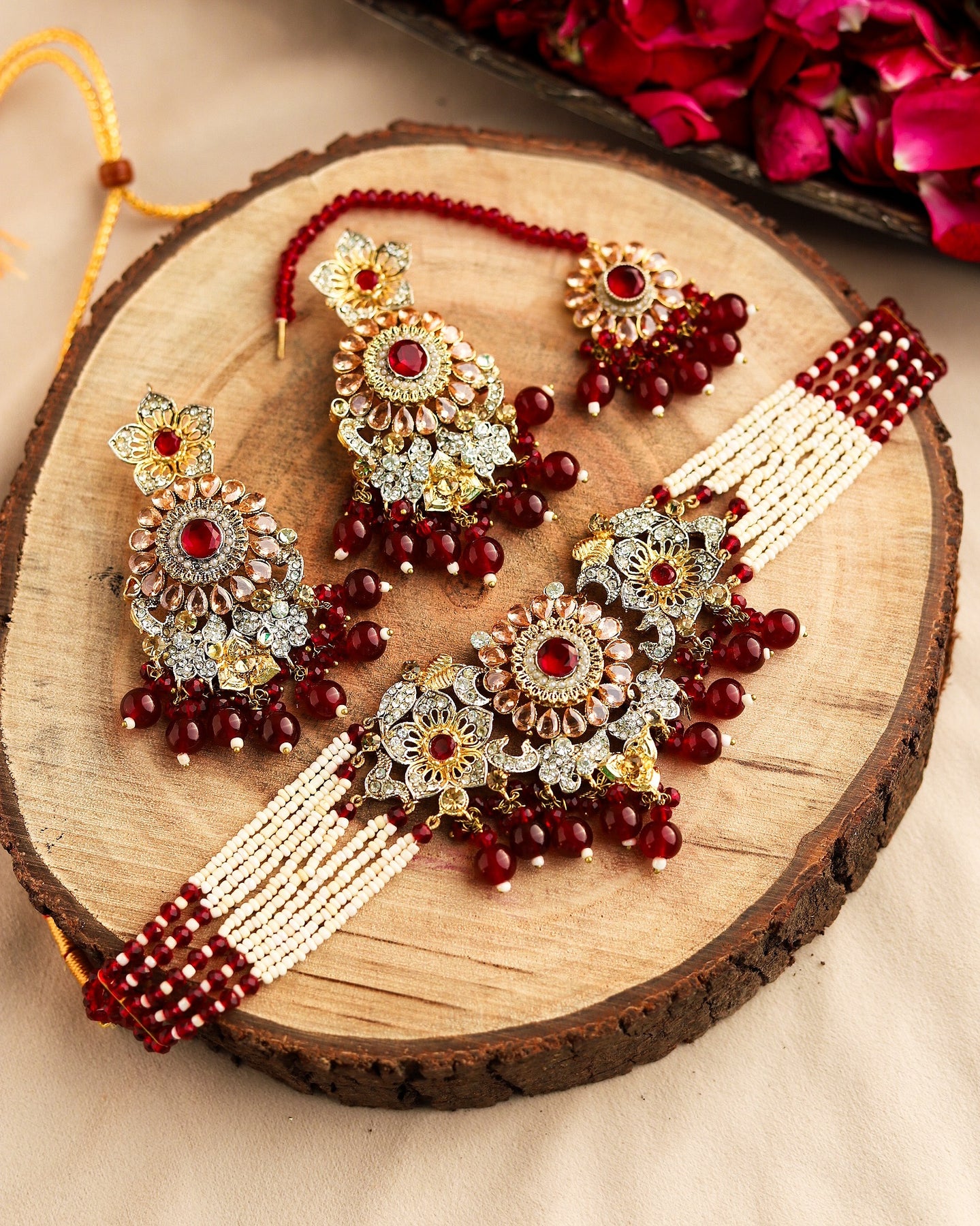 Elevate your ethnic look with this exquisite traditional choker set, crafted with intricate detailing. Perfect for weddings and festive occasions, it adds timeless elegance to any outfit.
