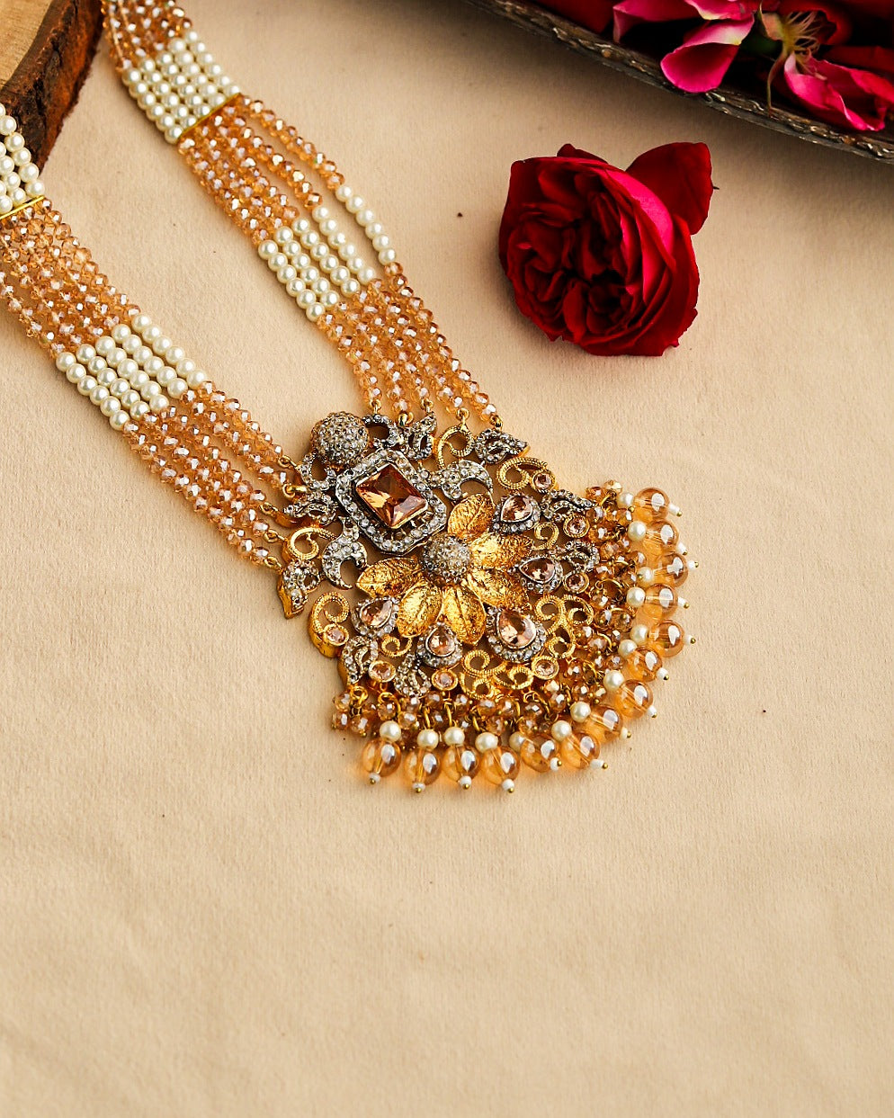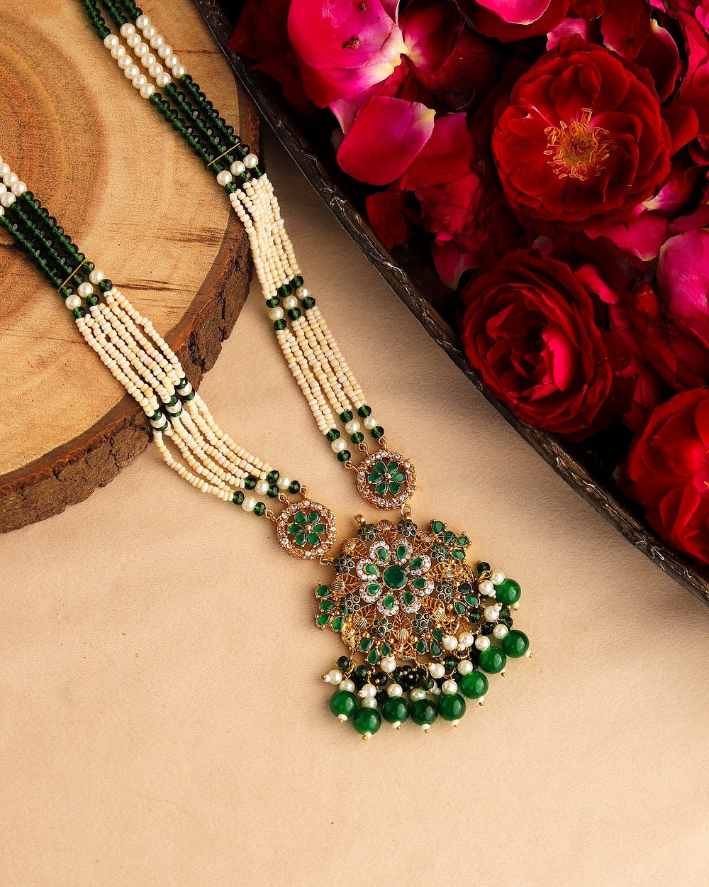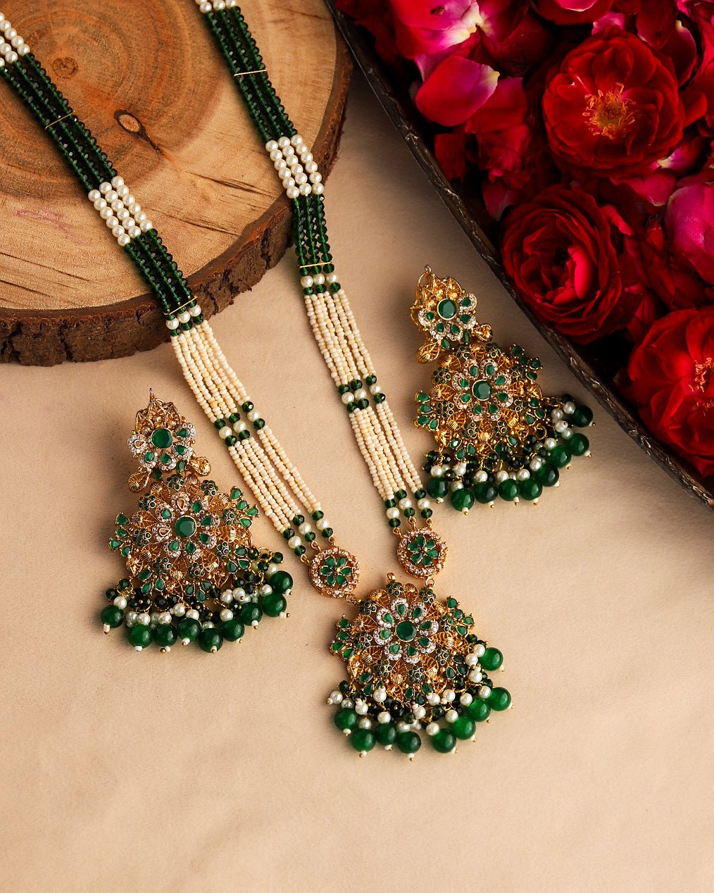 Grace your look with this stunning mala set, paired beautifully with matching earrings. A perfect fusion of tradition and elegance, ideal for weddings and festive wear.
