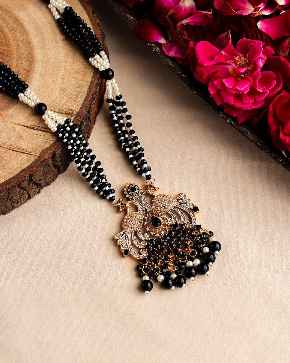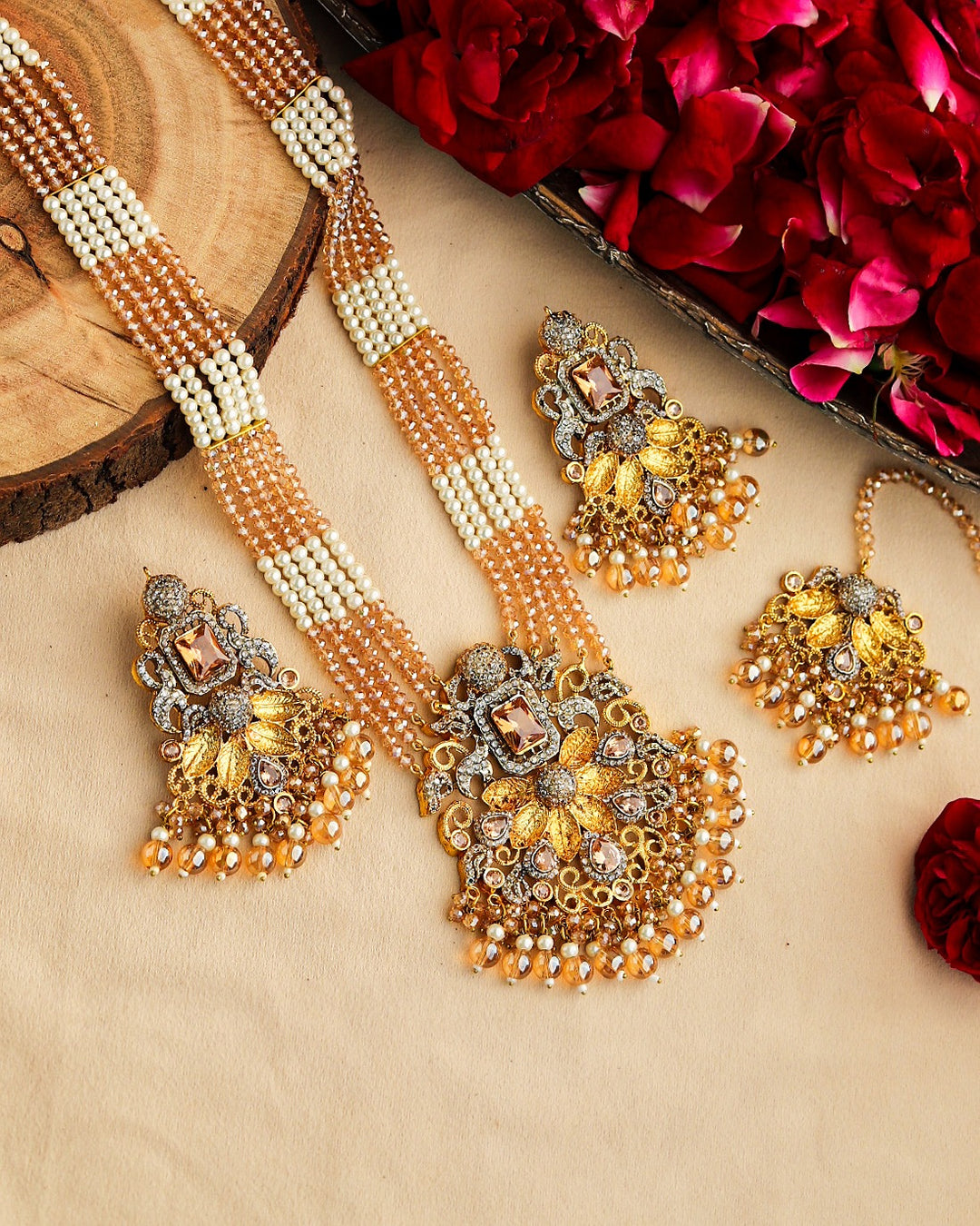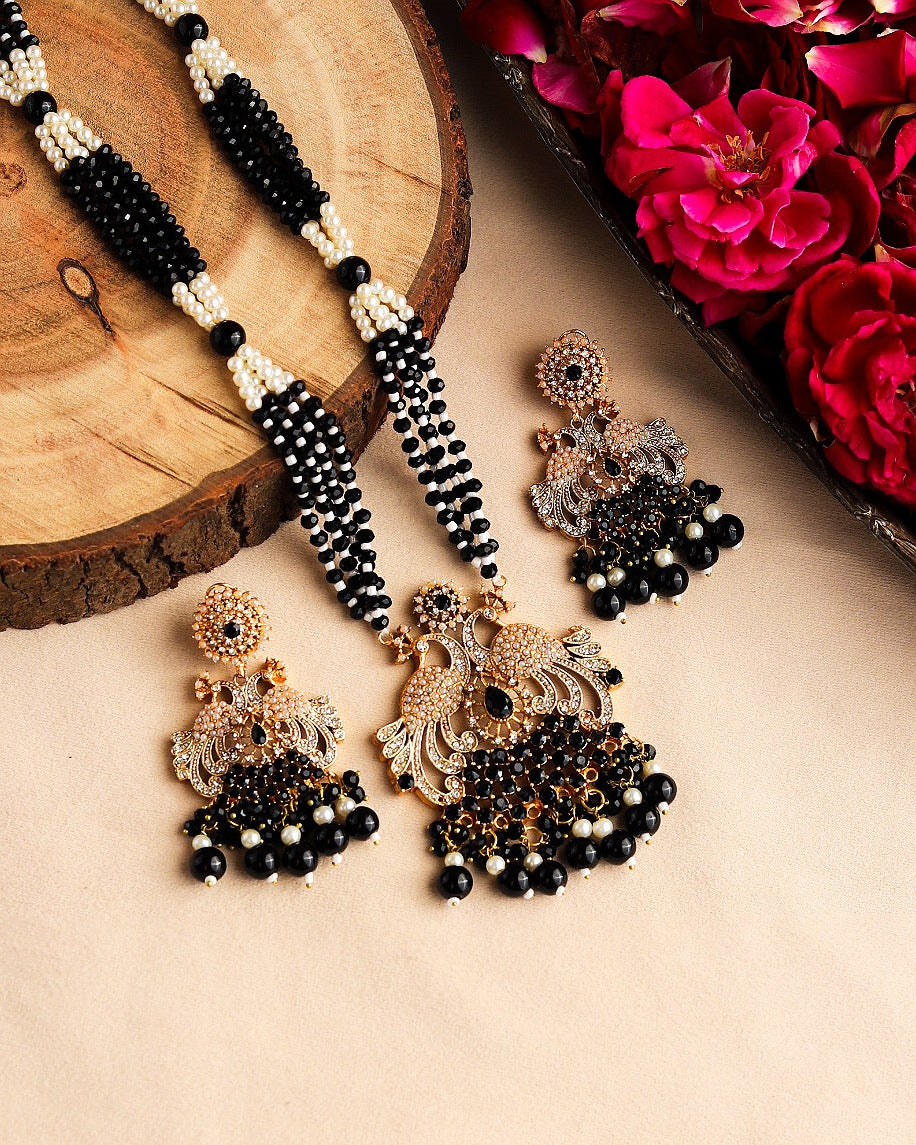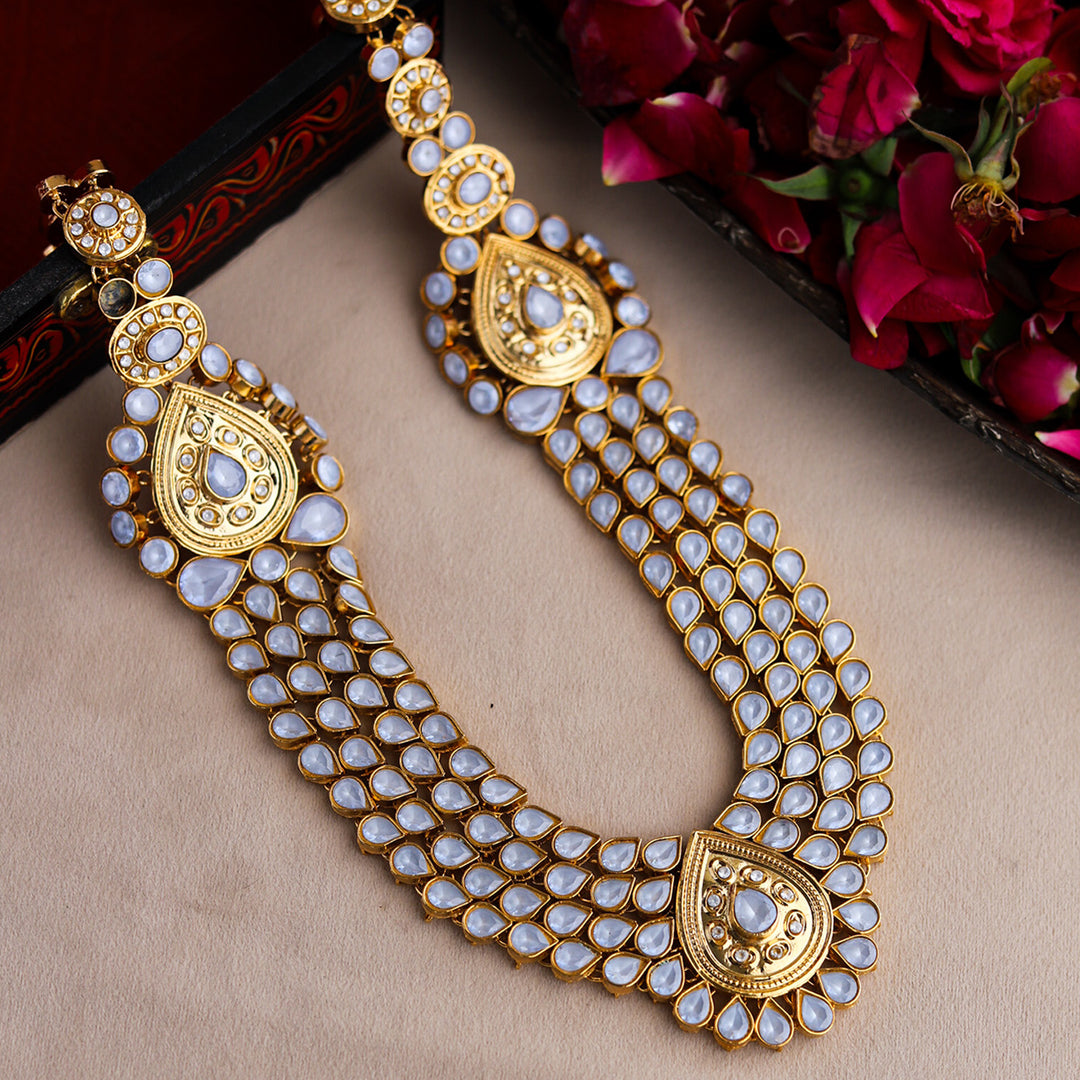 Grace your look with this stunning mala set, paired beautifully with matching earrings. A perfect fusion of tradition and elegance, ideal for weddings and festive wear.