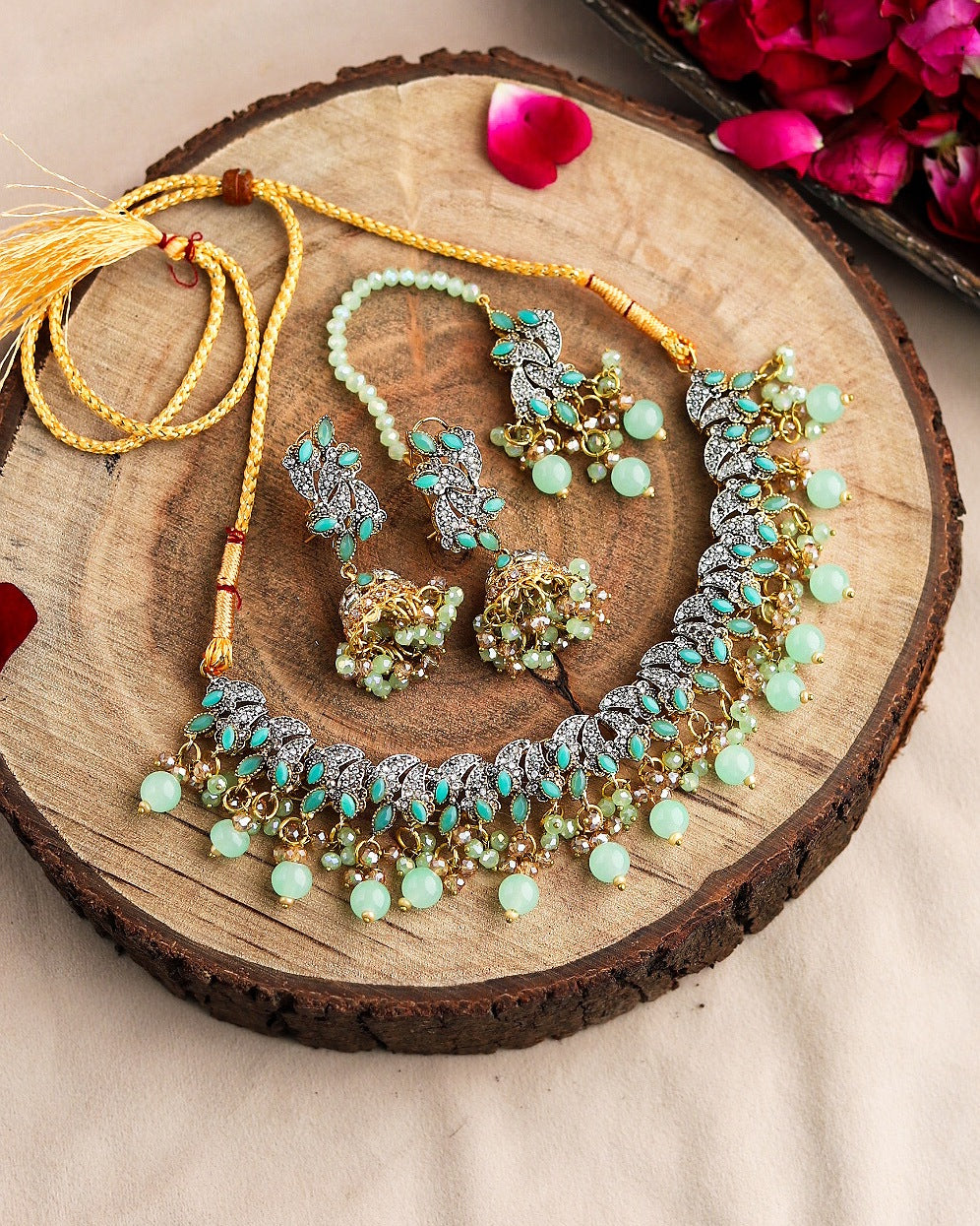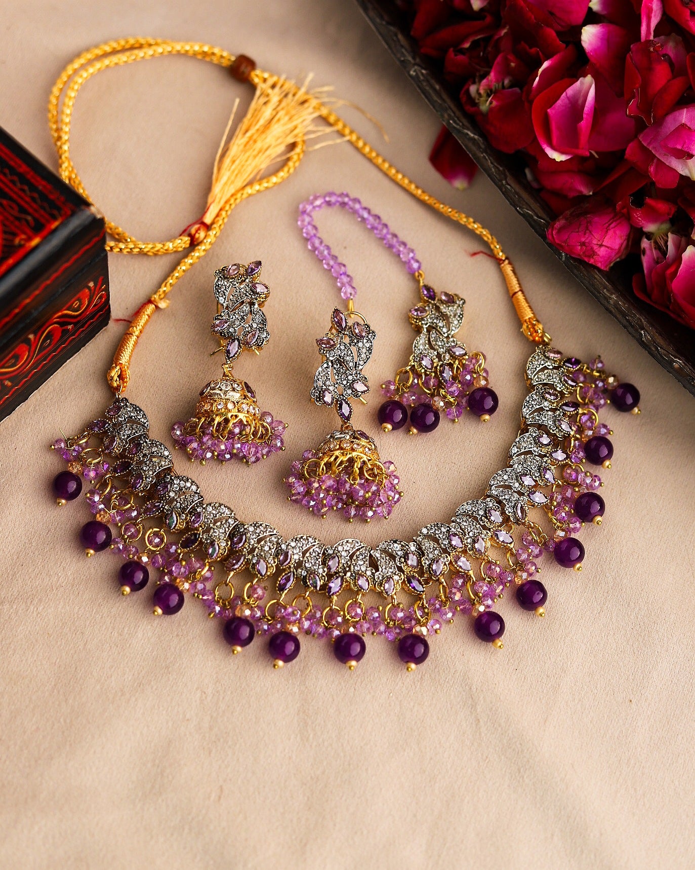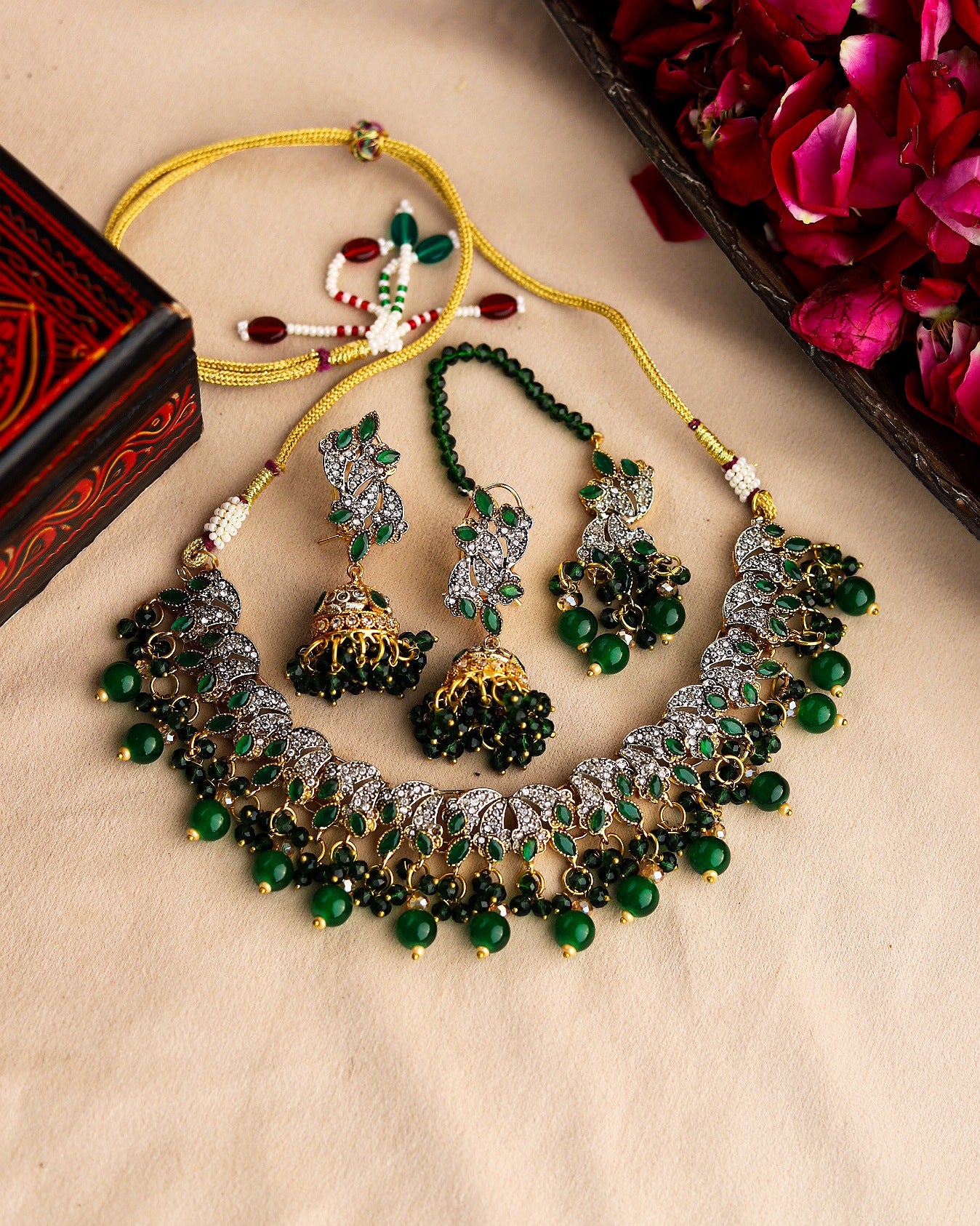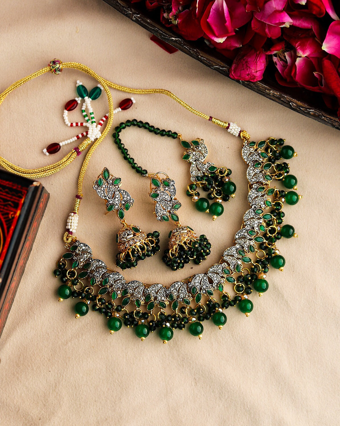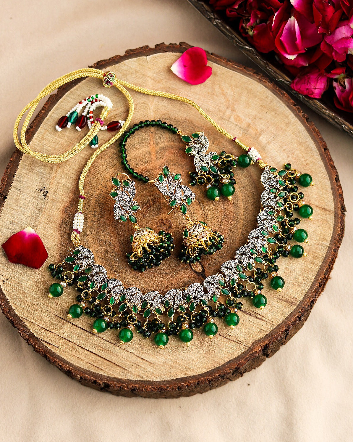 Elegant jewelry set featuring a stunning necklace, matching earrings, and a traditional bindi. Perfect for completing your festive or bridal look with grace and charm.
