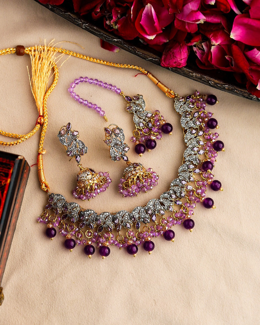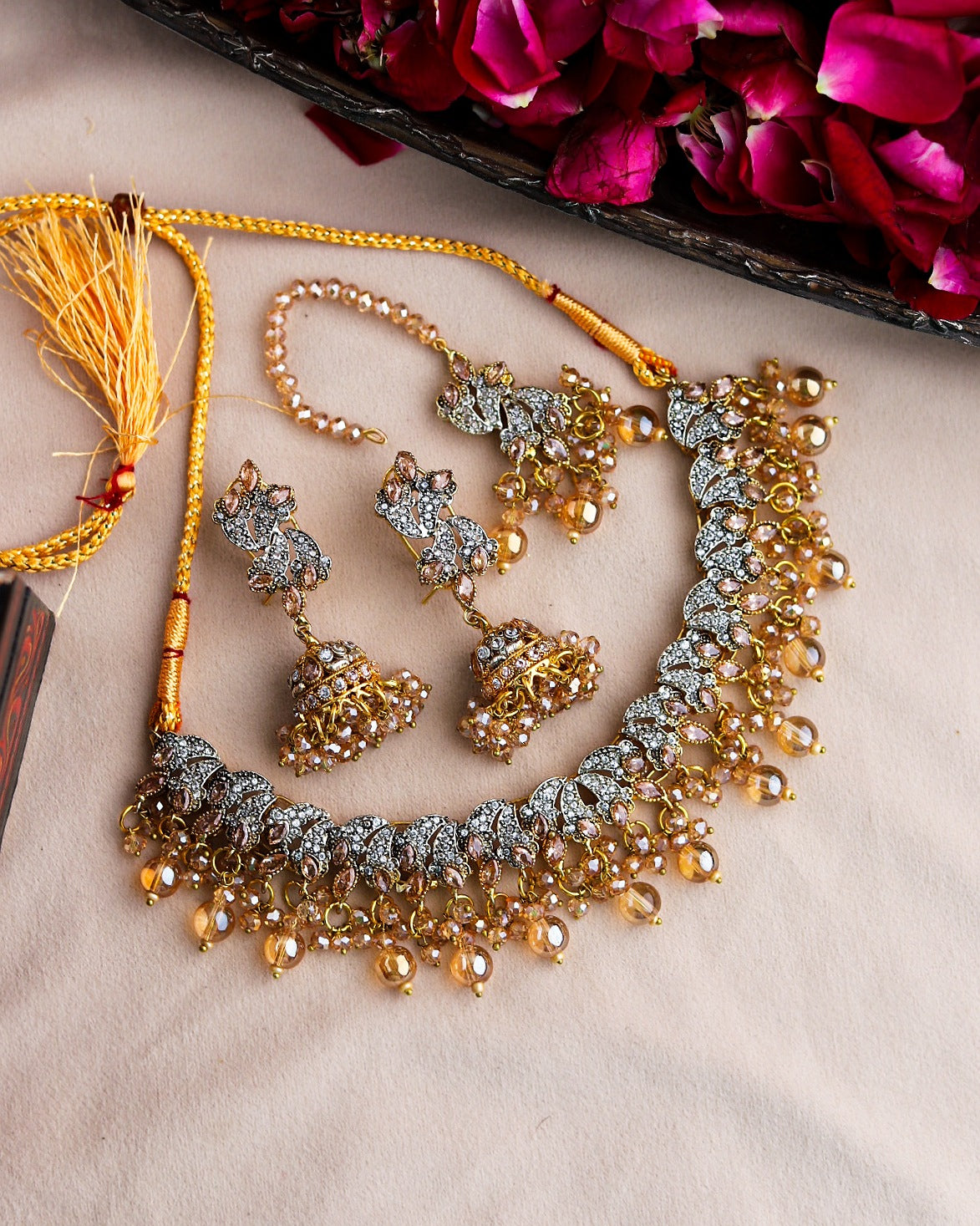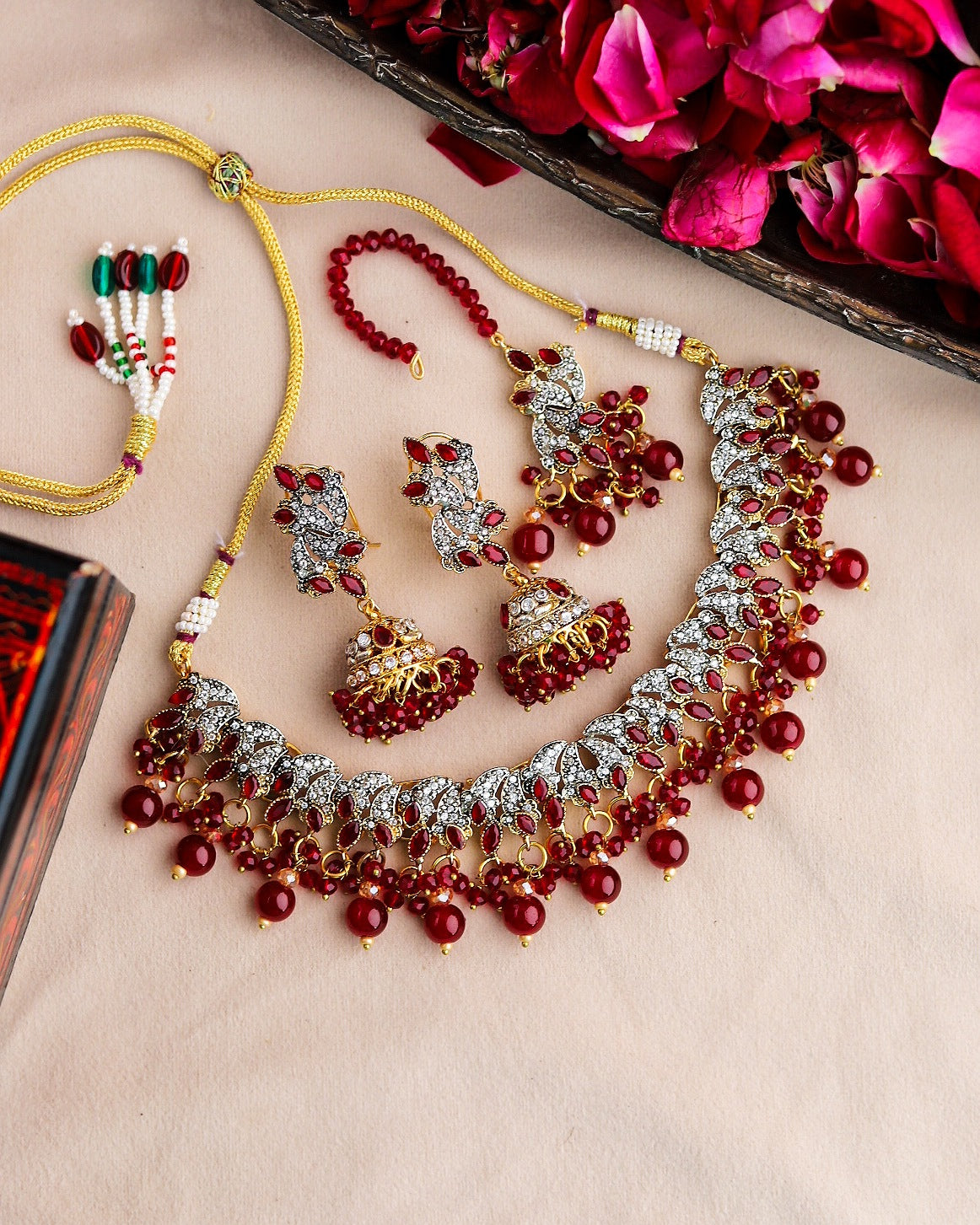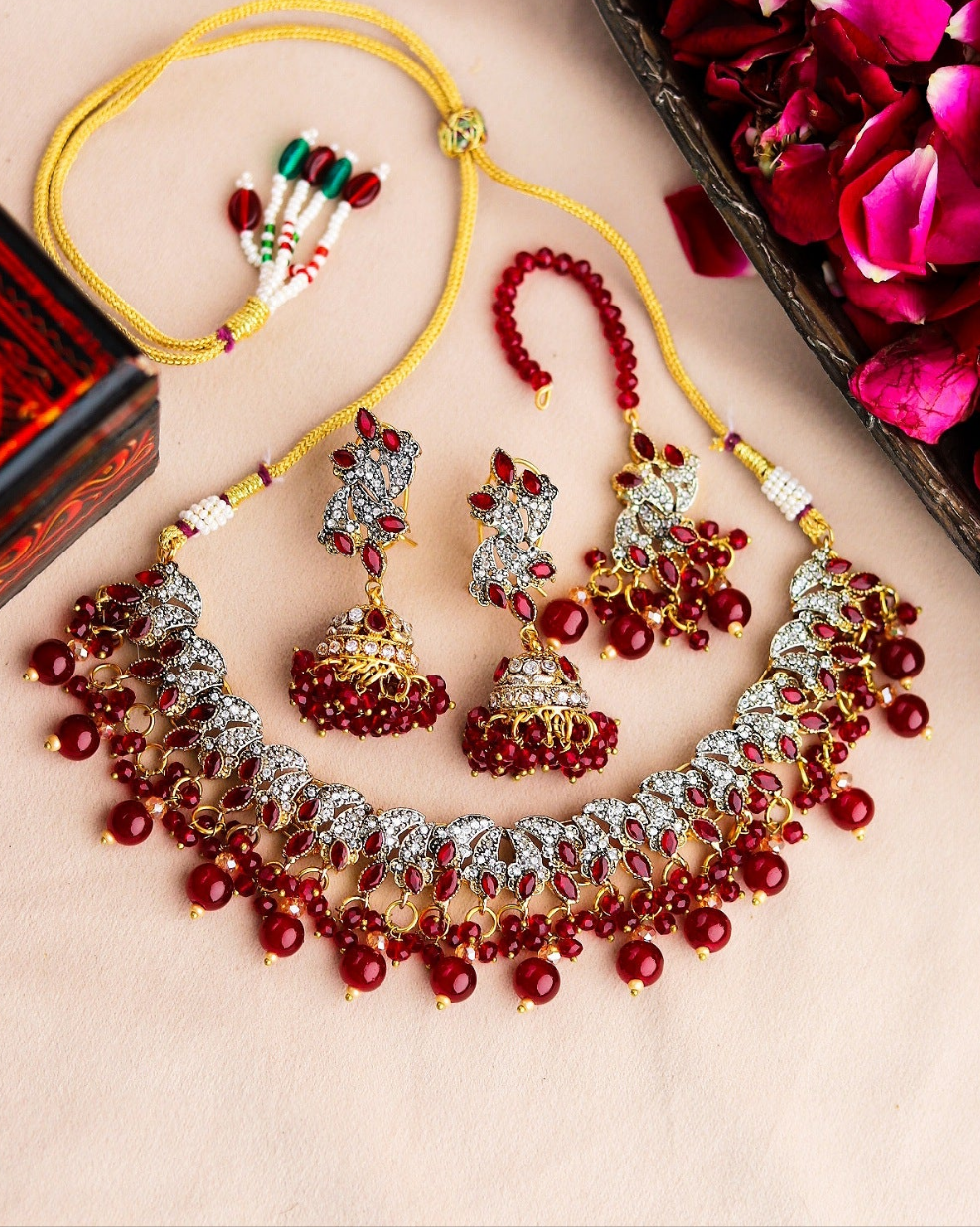 Elegant jewelry set featuring a stunning necklace, matching earrings, and a traditional bindi. Perfect for completing your festive or bridal look with grace and charm.