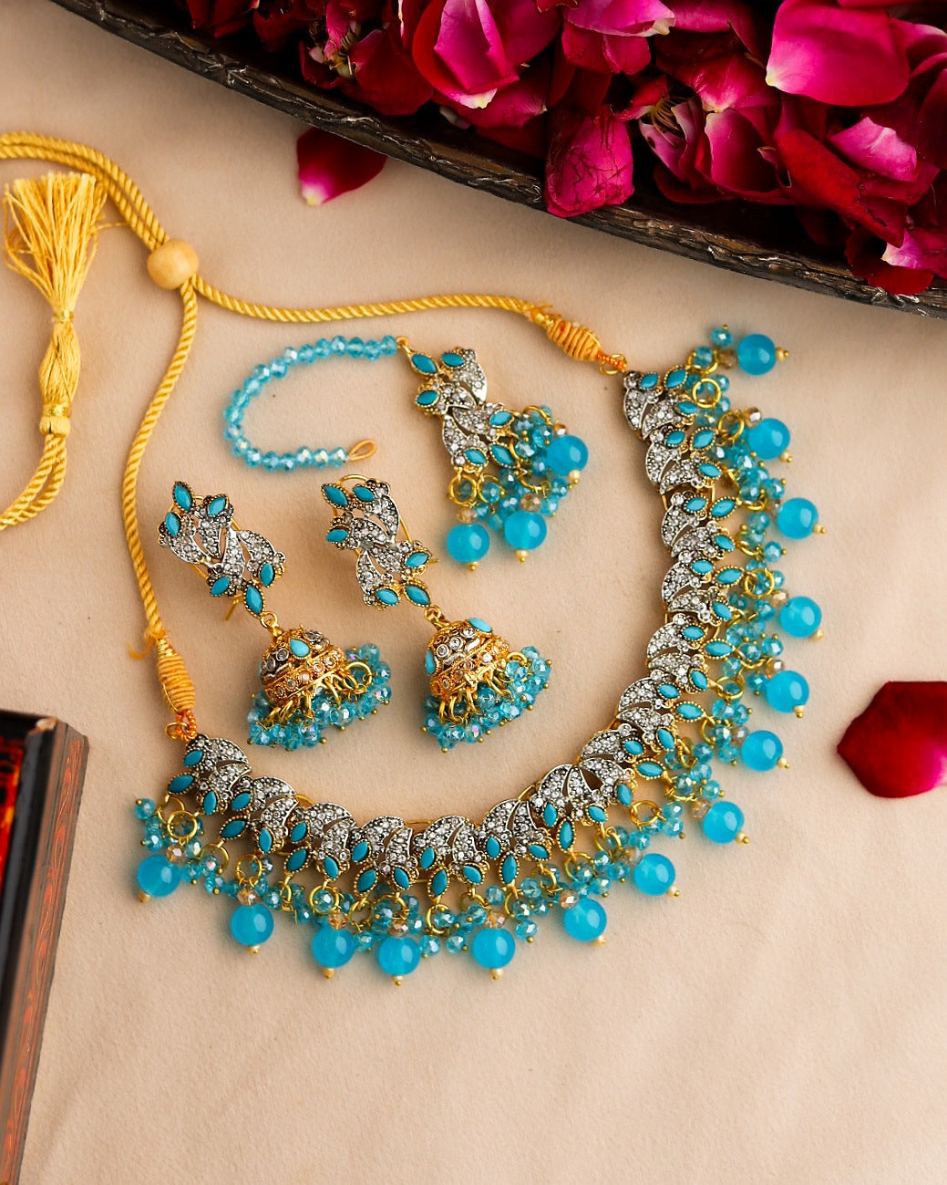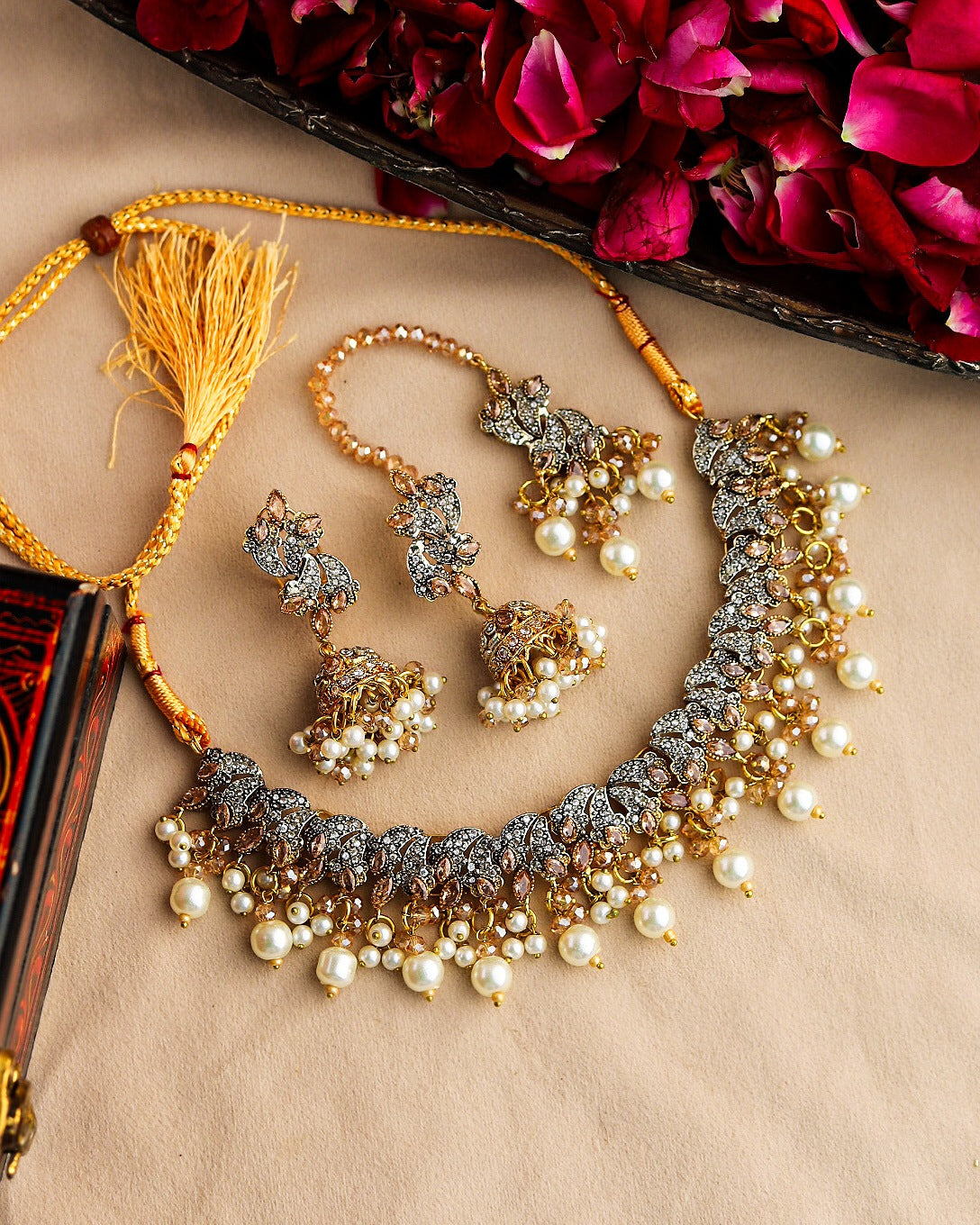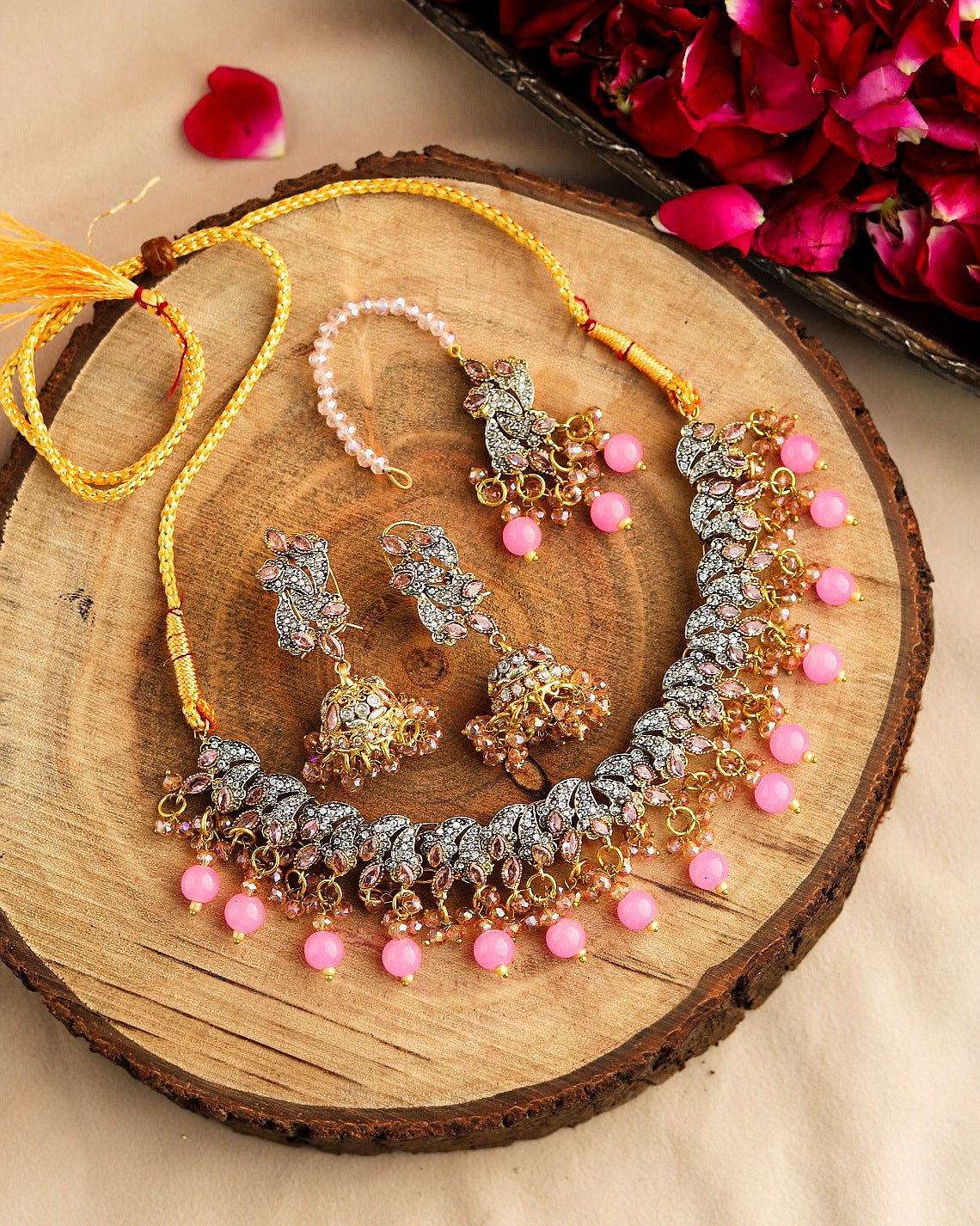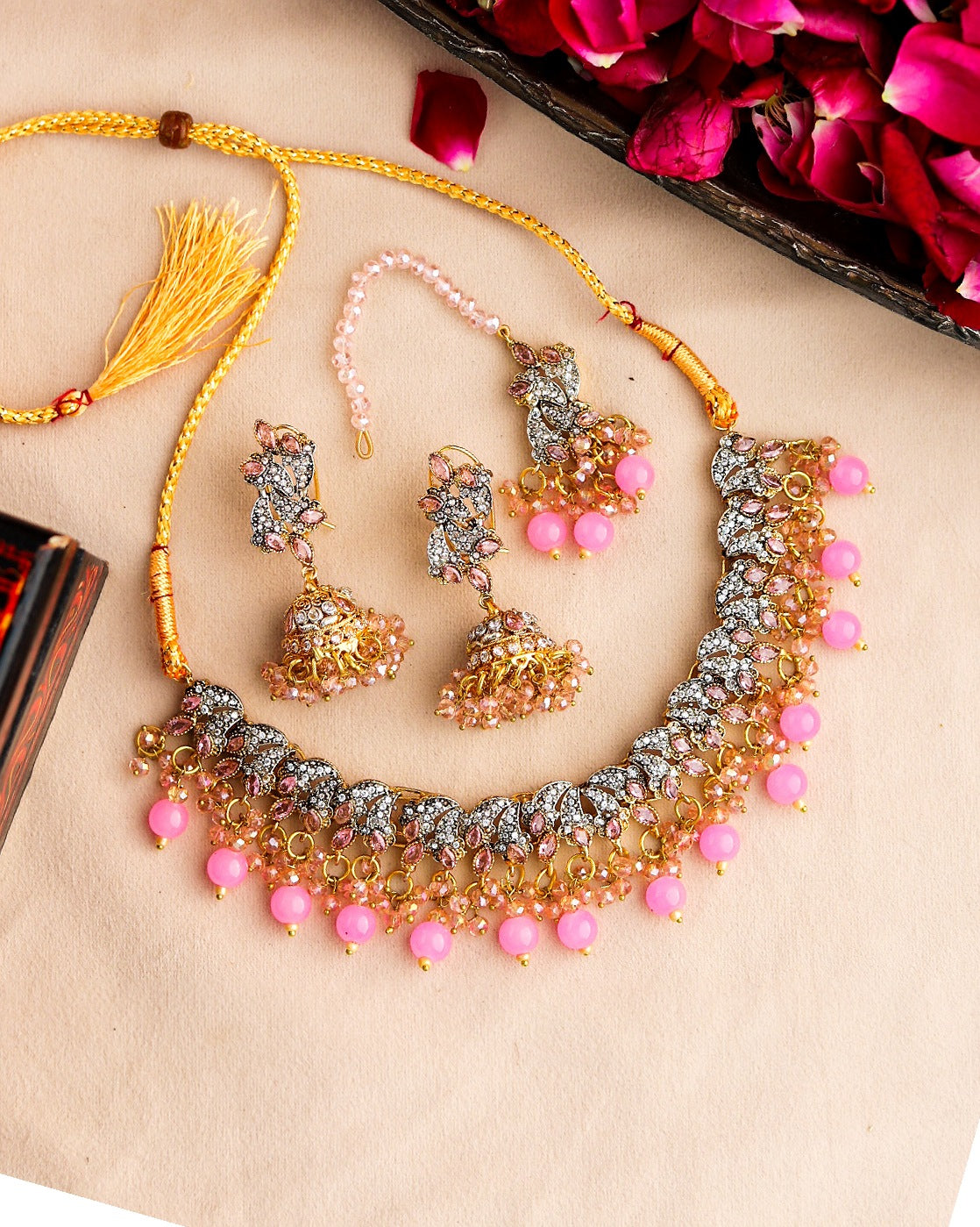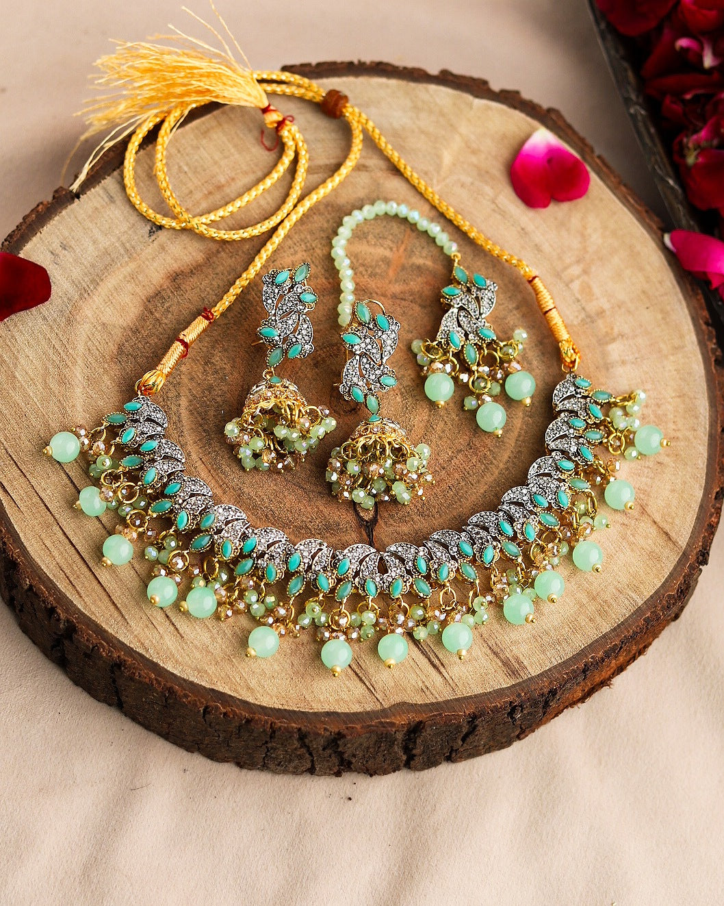 Elegant jewelry set featuring a stunning necklace, matching earrings, and a traditional bindi. Perfect for completing your festive or bridal look with grace and charm.