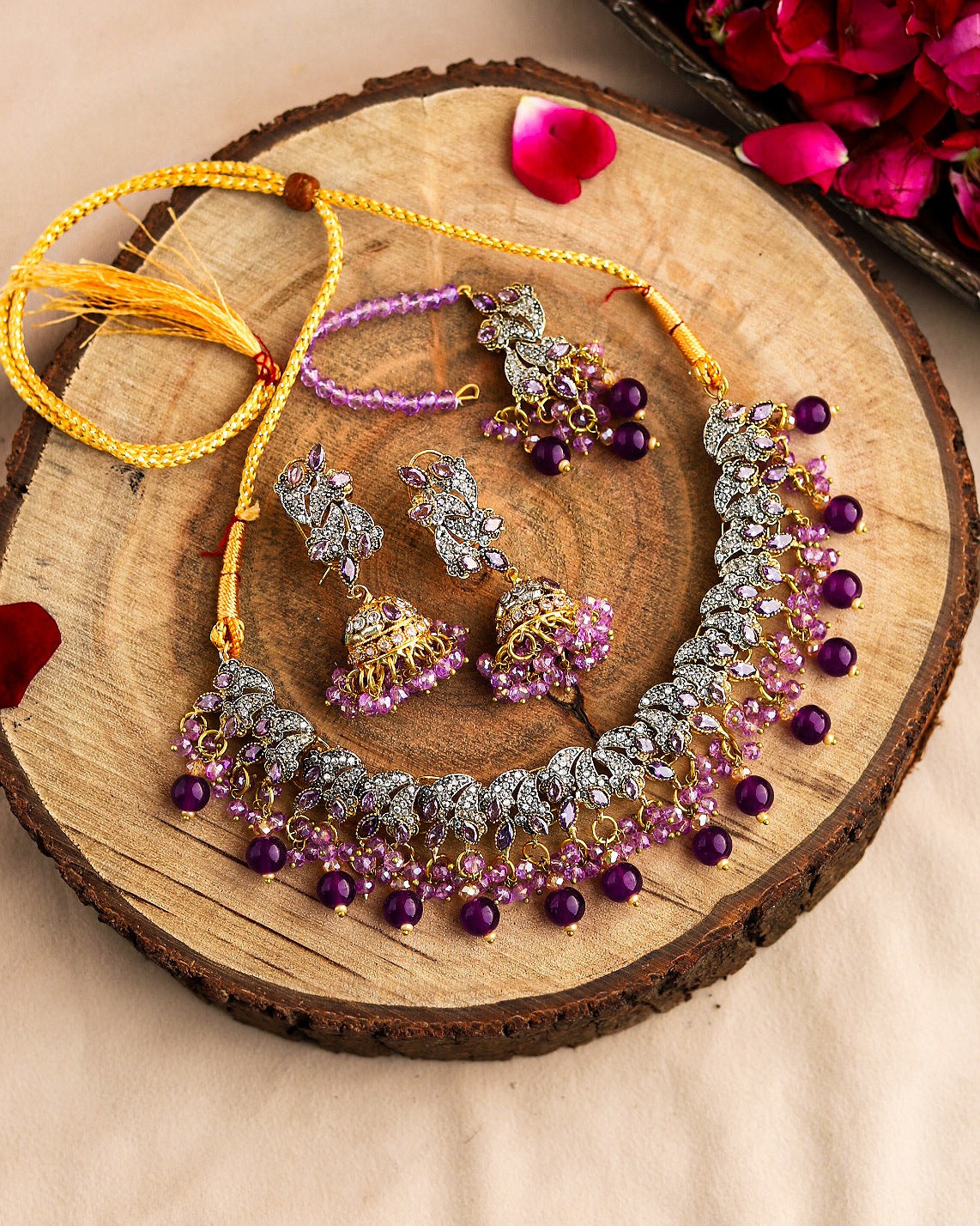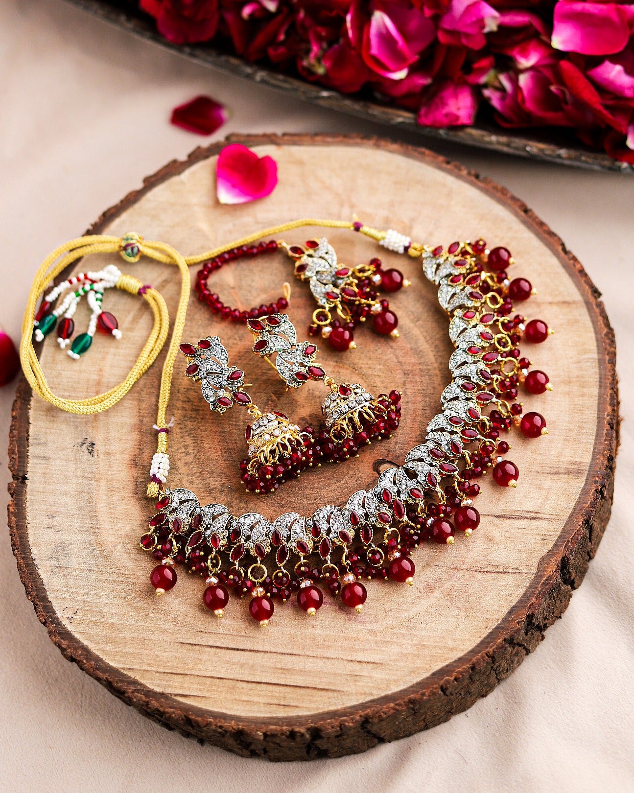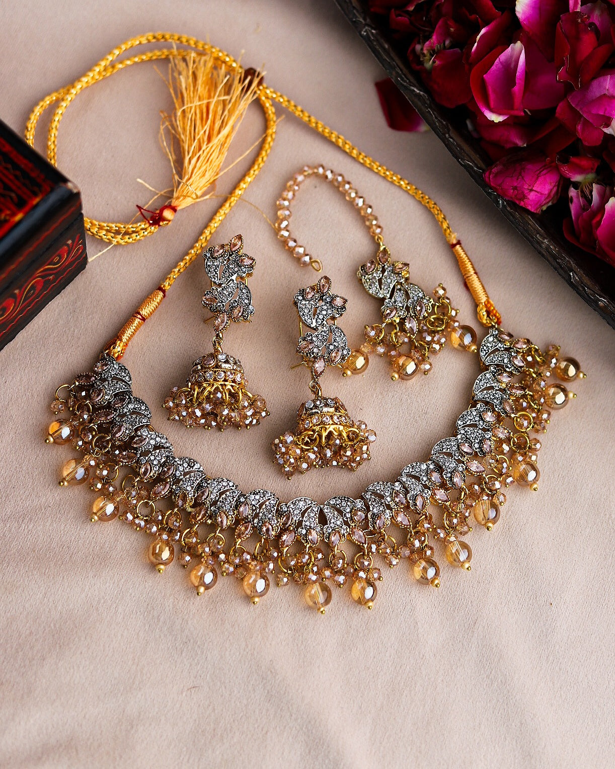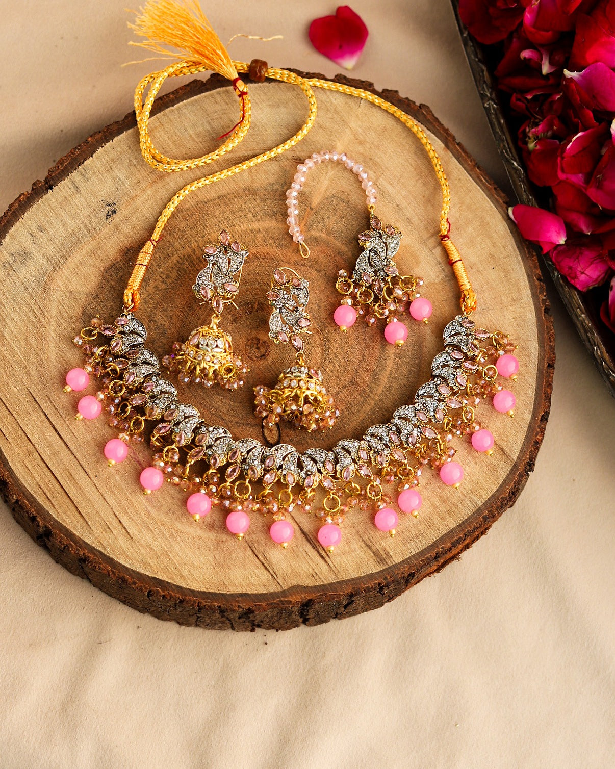Elegant jewelry set featuring a stunning necklace, matching earrings, and a traditional bindi. Perfect for completing your festive or bridal look with grace and charm.