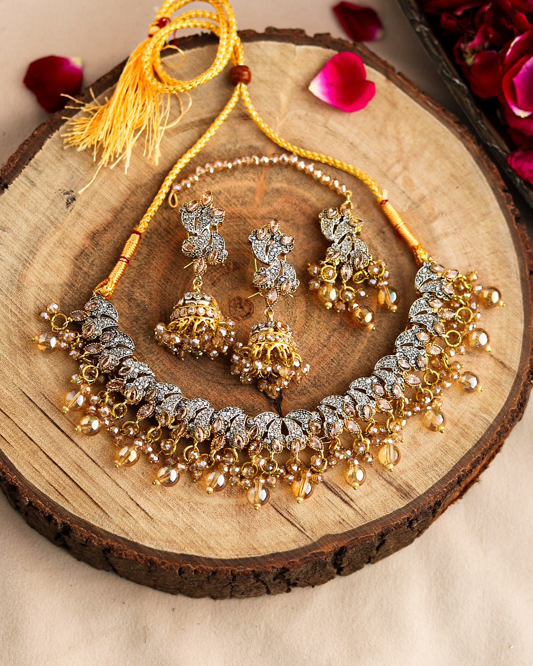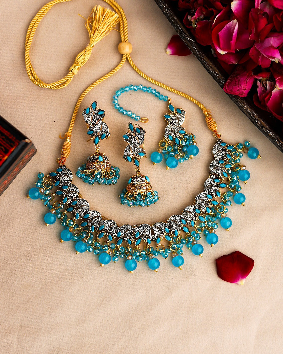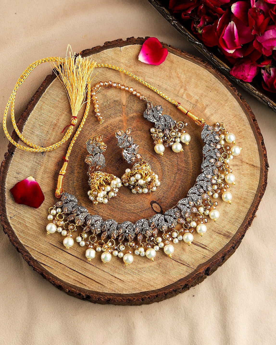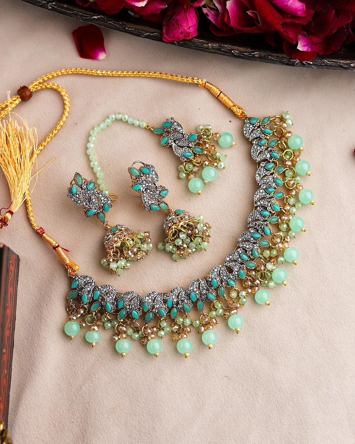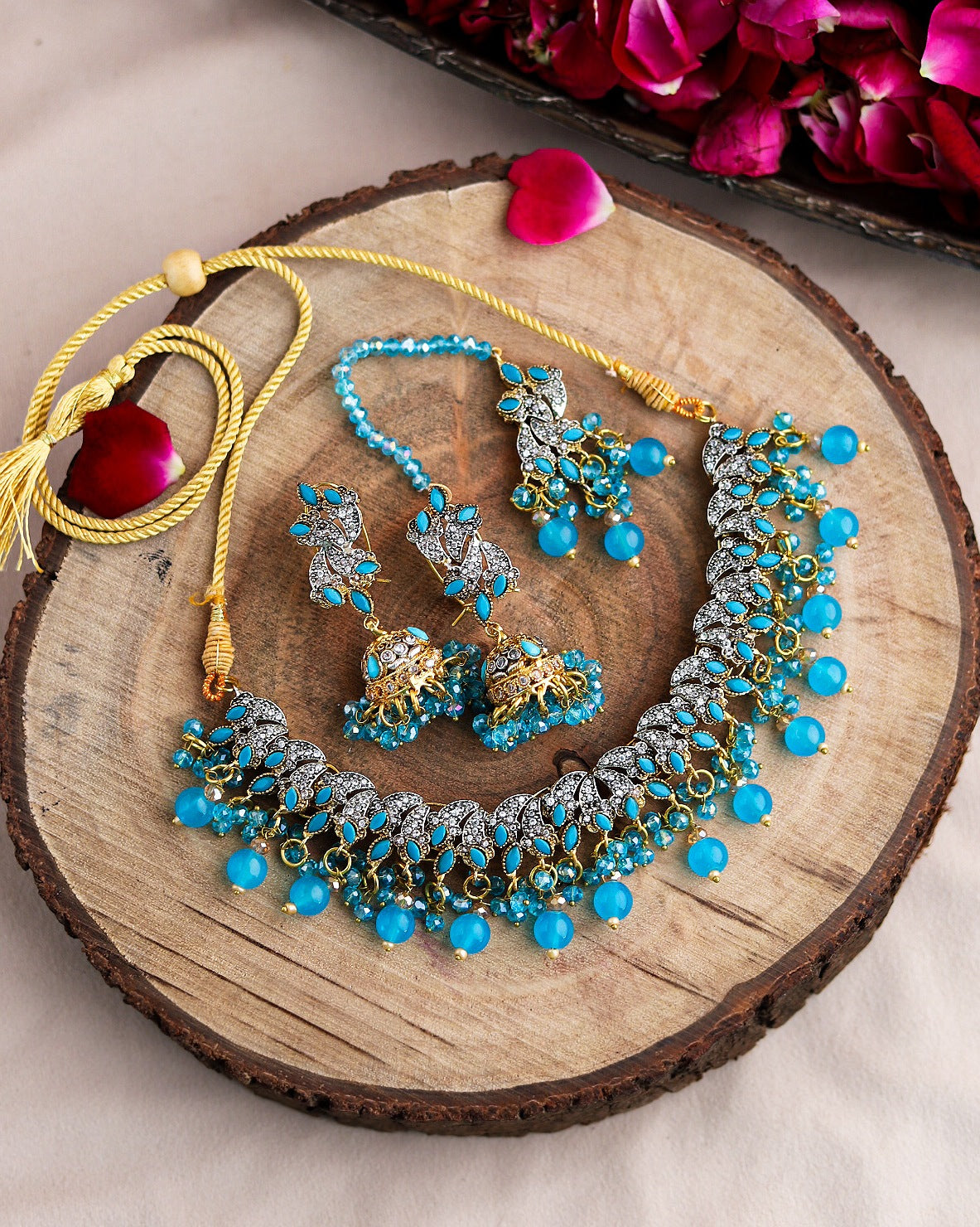 Elegant jewelry set featuring a stunning necklace, matching earrings, and a traditional bindi. Perfect for completing your festive or bridal look with grace and charm.
